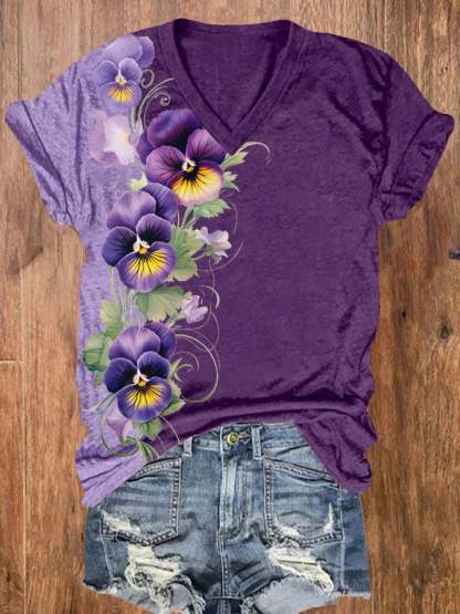 Women's Alzheimer's Purple Floral Print V-Neck T-Shirt