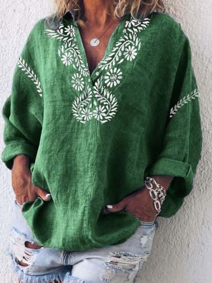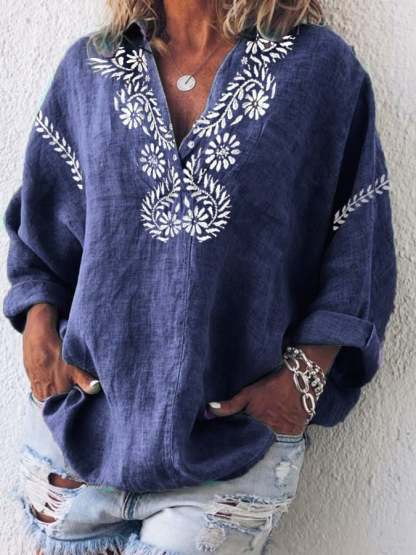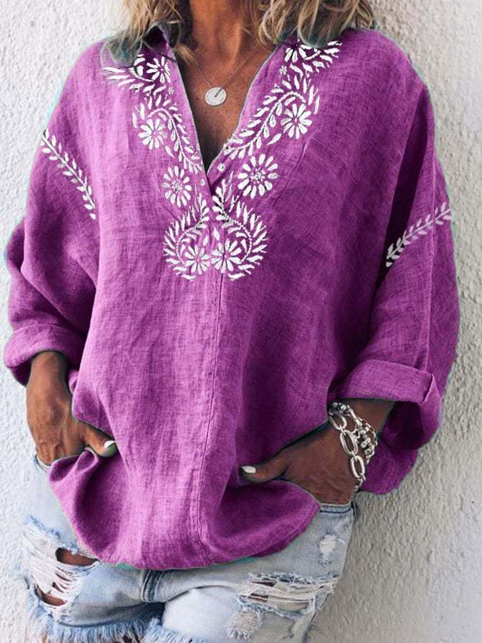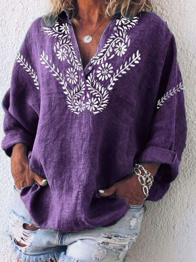 Women's Cotton And Linen Purple Floral V-Neck Top