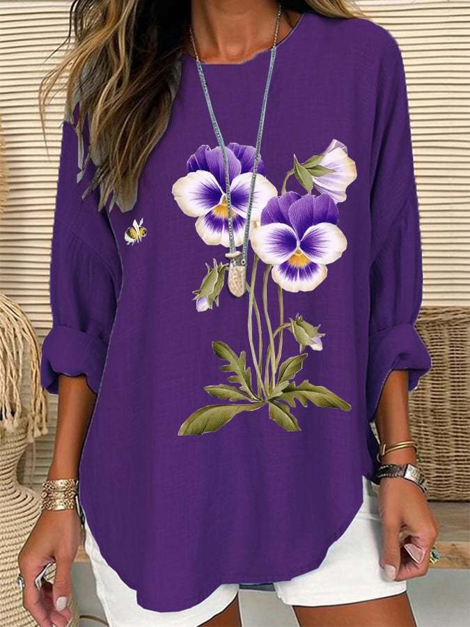 Women's Purple Floral Loose Long Sleeve Crew Neck Top