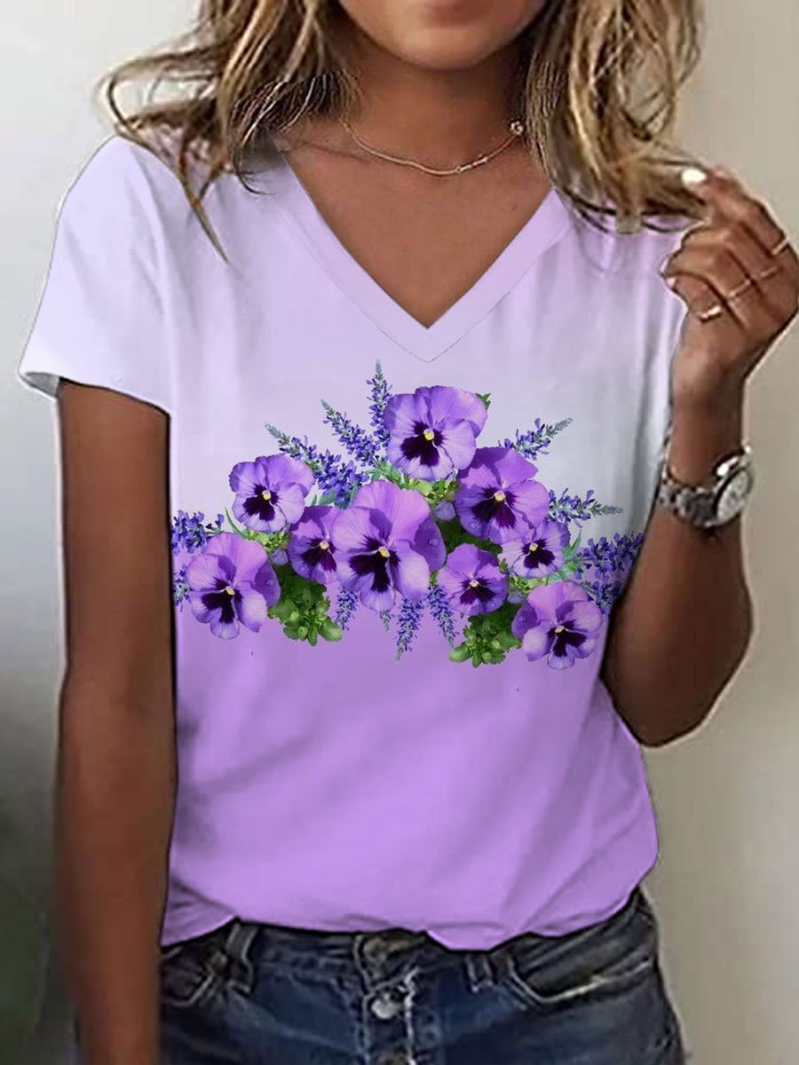 Women's Purple Flower Alzheimer's Awareness Support Print V-neck T-shirt