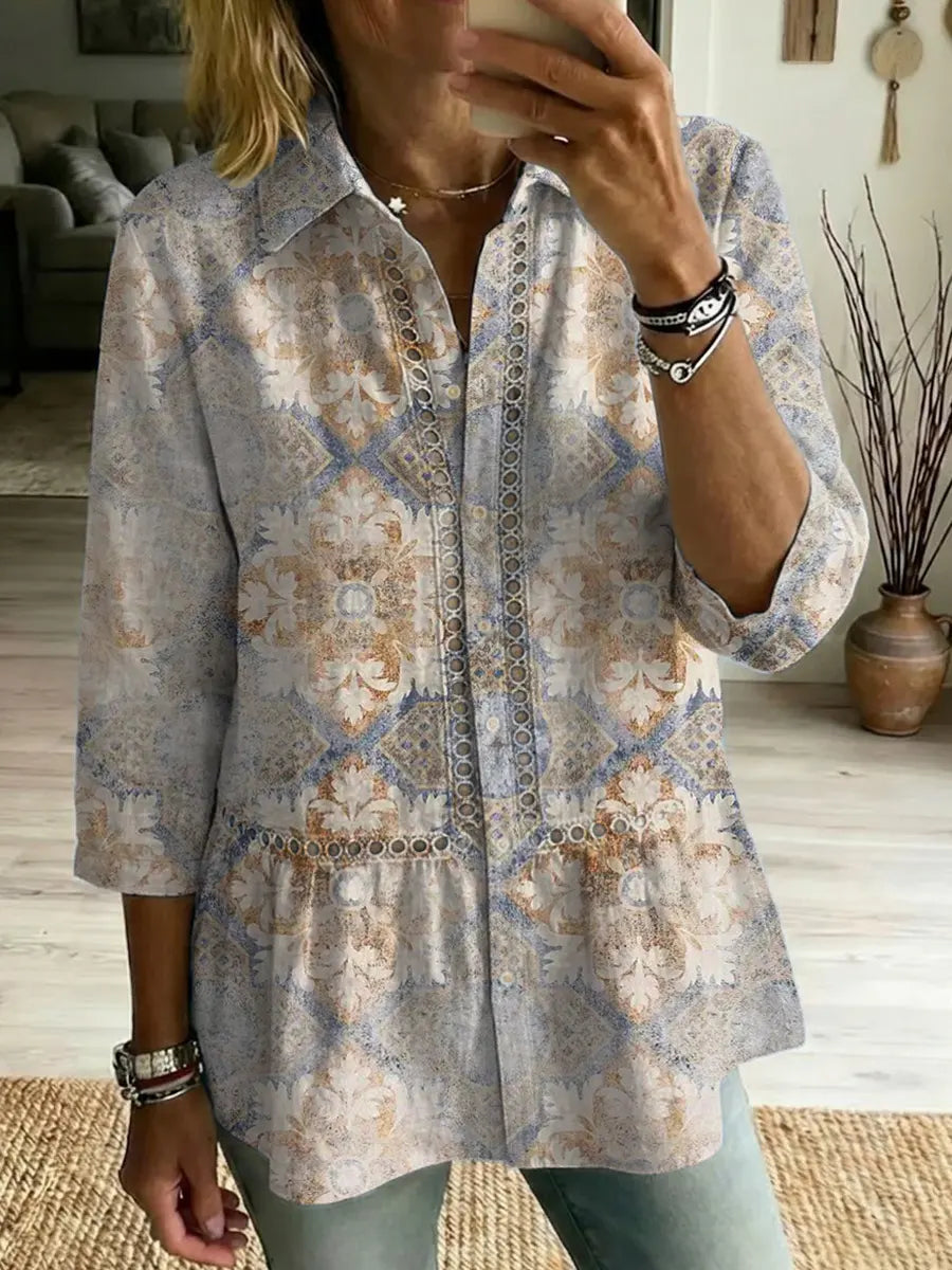 Women's Retro Ethnic Art Print Casual Lapel Cotton Shirt