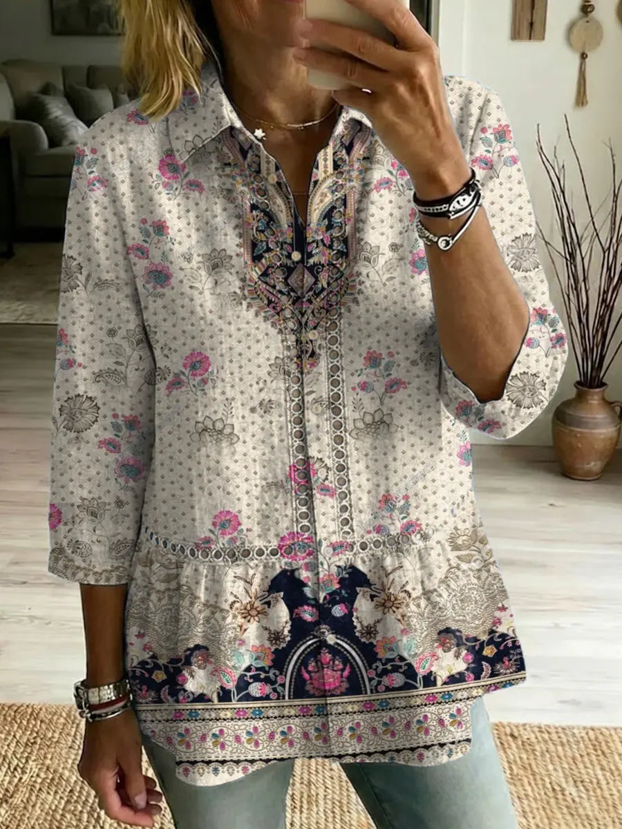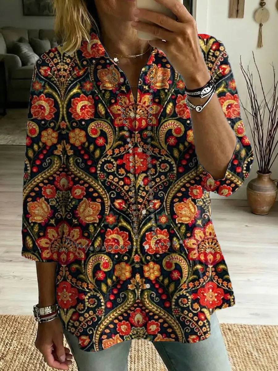 Women's Retro Ethnic Floral Art Print Casual Lapel Cotton Shirt