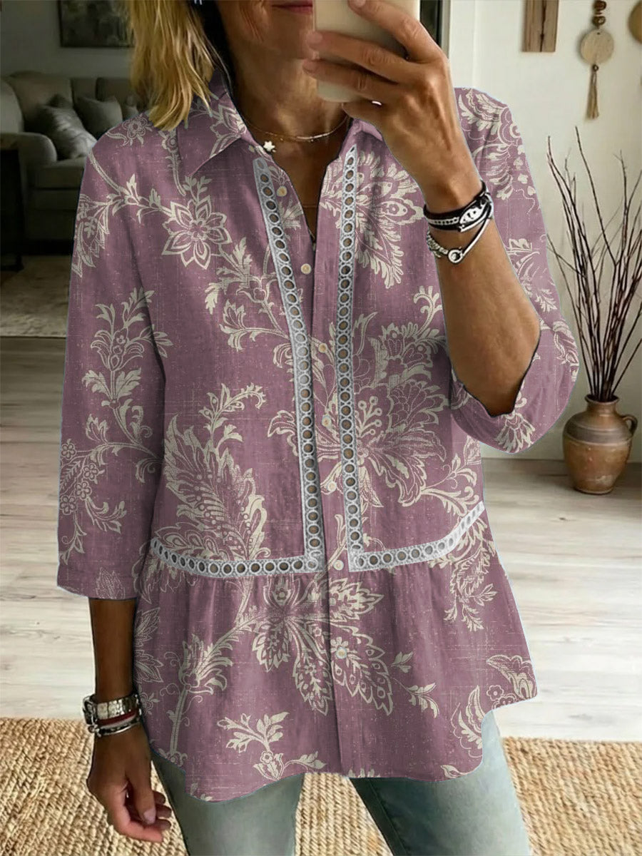 Women's Retro Flower Art Print Linen Cotton Shirt