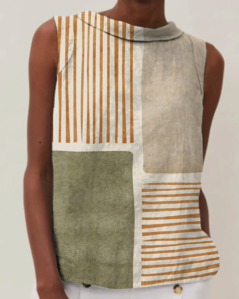 Retro Geometric Print Cotton and Linen Round Neck Sleeveless Top