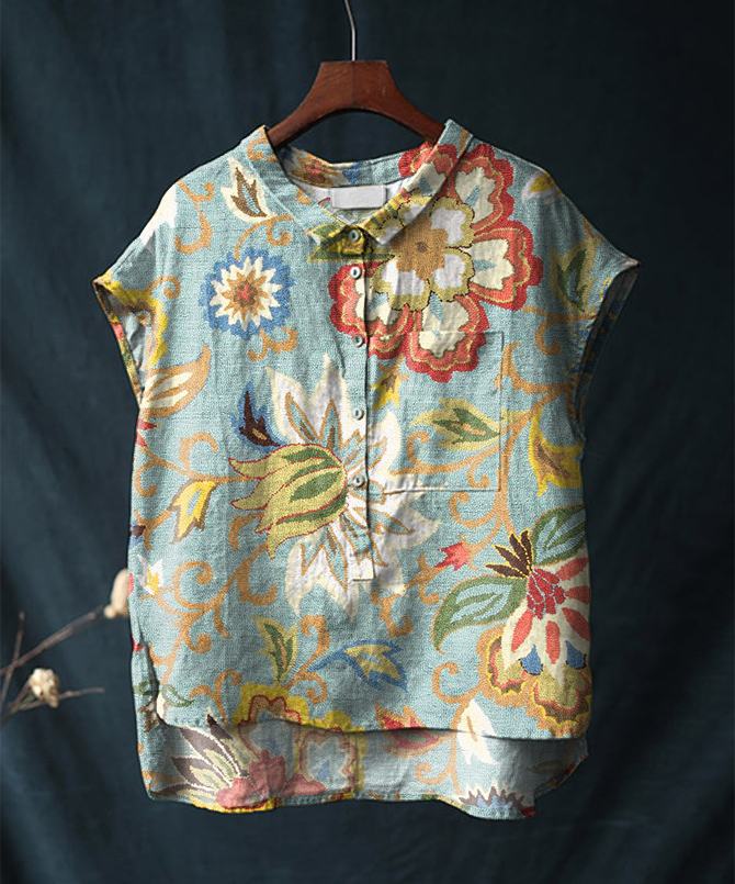 Vintage Floral Print Short-sleeved Cotton and Linen Shirt