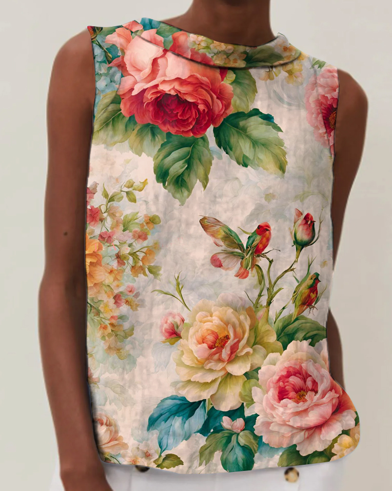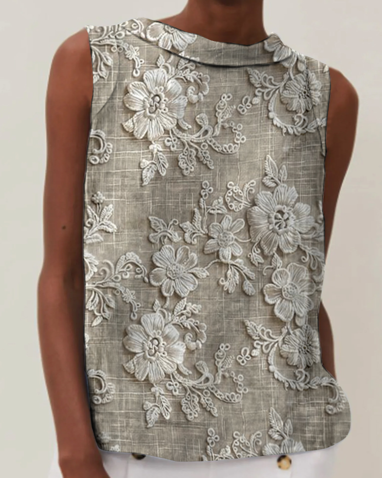 Vintage Floral Print Cotton and Linen Round Neck Sleeveless Top