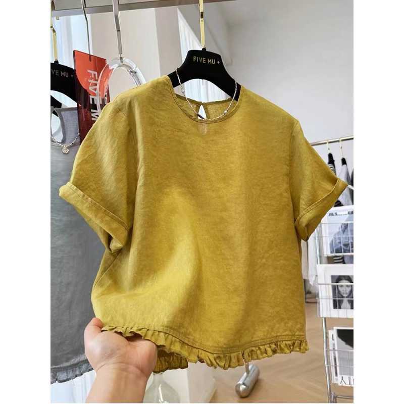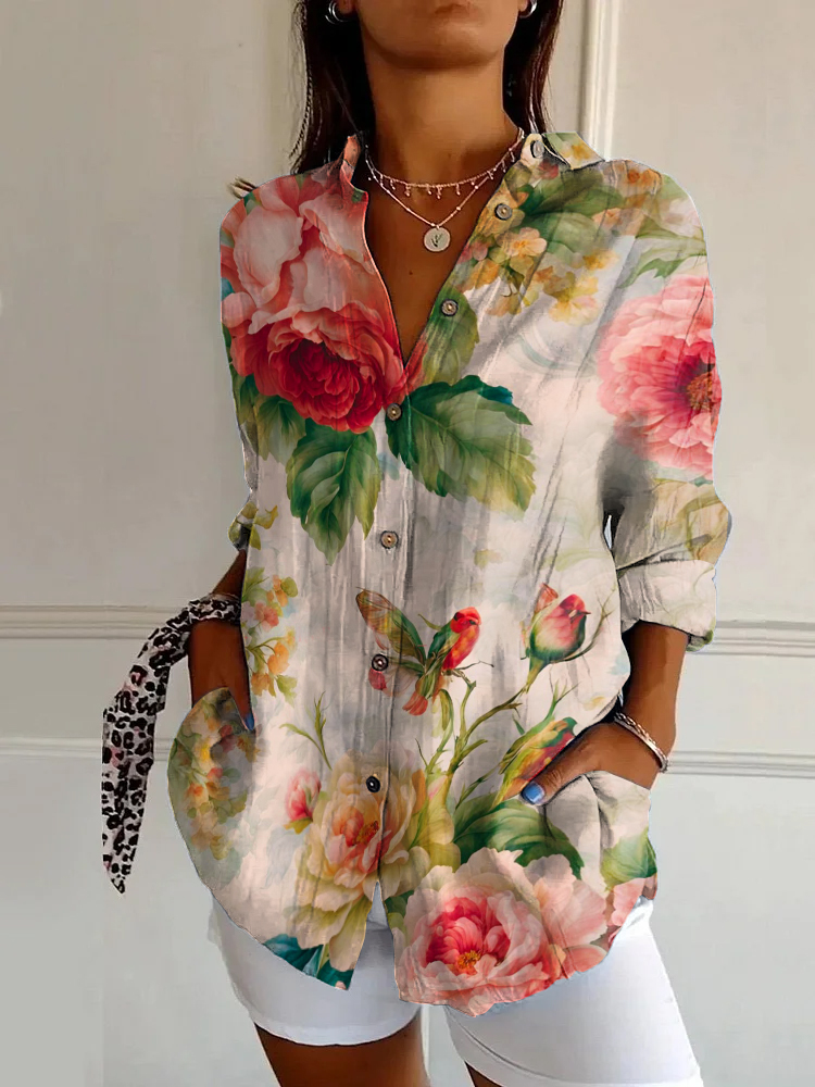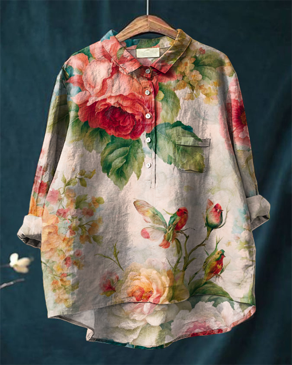 Women's Vintage Flowers Art Print Casual Cotton And Linen Ruffle Shirt
