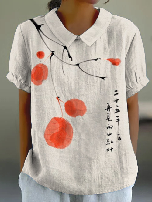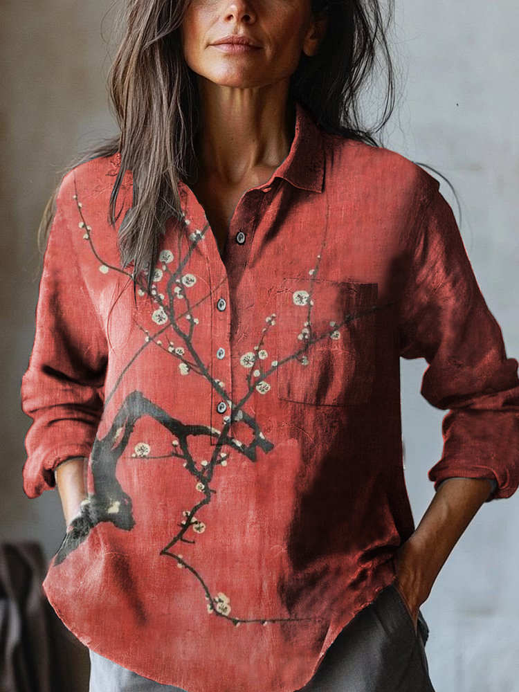 Women's Japanese Red Classic Plum BlossomArt Print Casual Cotton And Linen Shirt