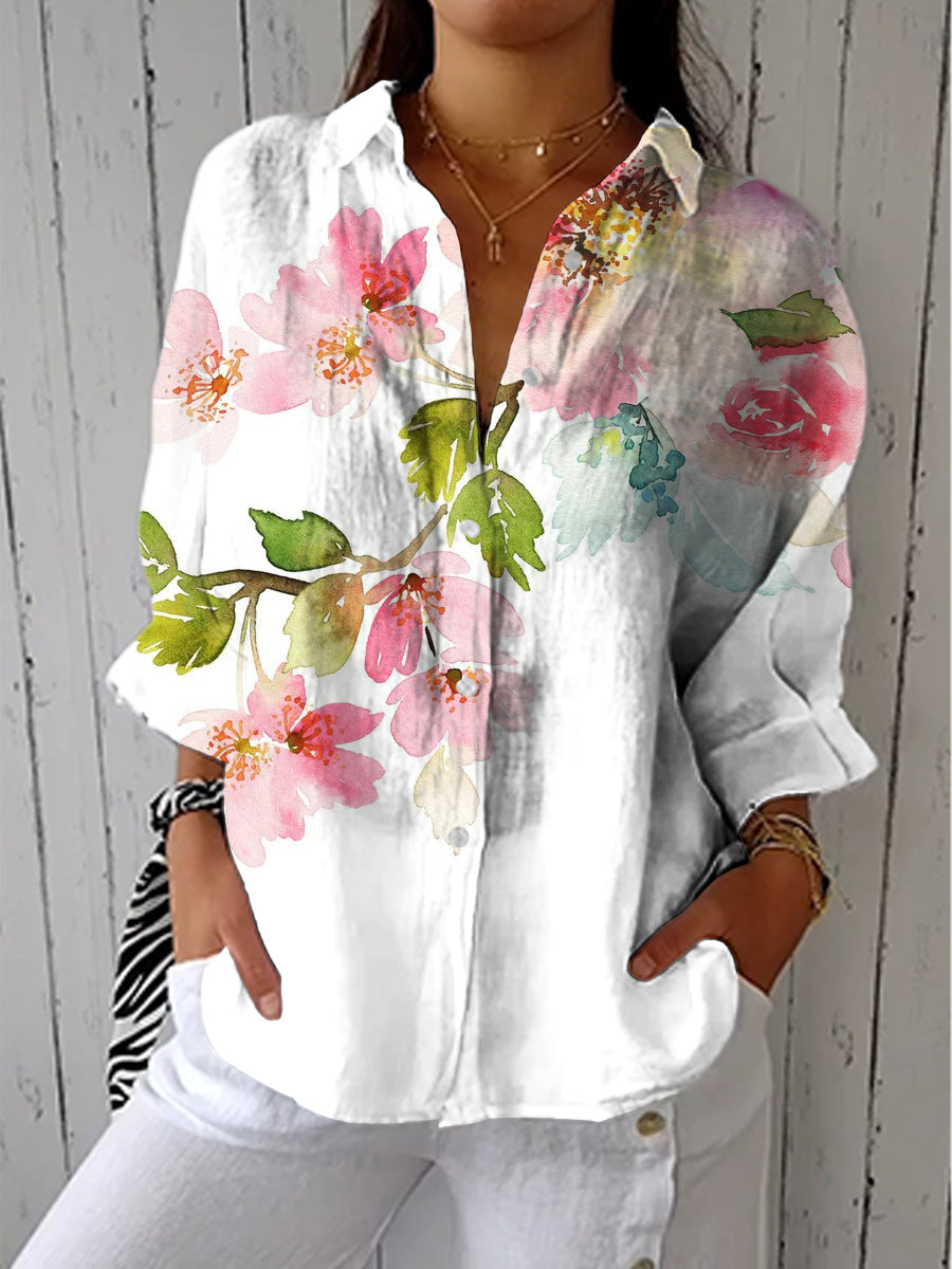 Vintage Floral Print Casual Long-sleeved Cotton and Linen Shirt