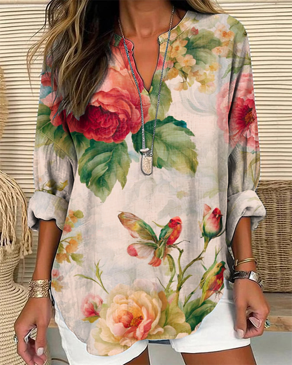 Women's Art Ink Flower Print Casual Linen V-neck Shirt