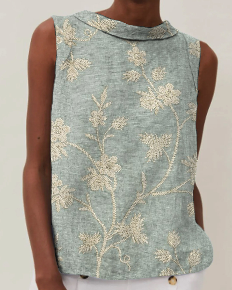 Vintage Embroidered Floral Print Cotton and Linen Crew Neck Sleeveless Top