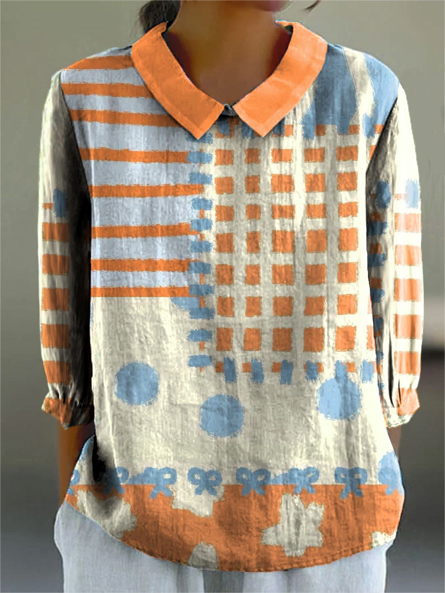Women's Vintage Color Block Plaid Art Print Casual Cotton And Linen 3/4 Sleeve Shirt