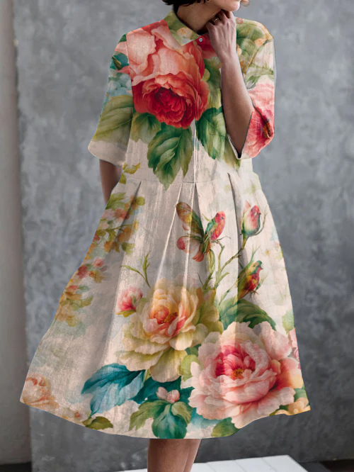 Vintage Floral Print Casual Pocket Half Sleeve Dress
