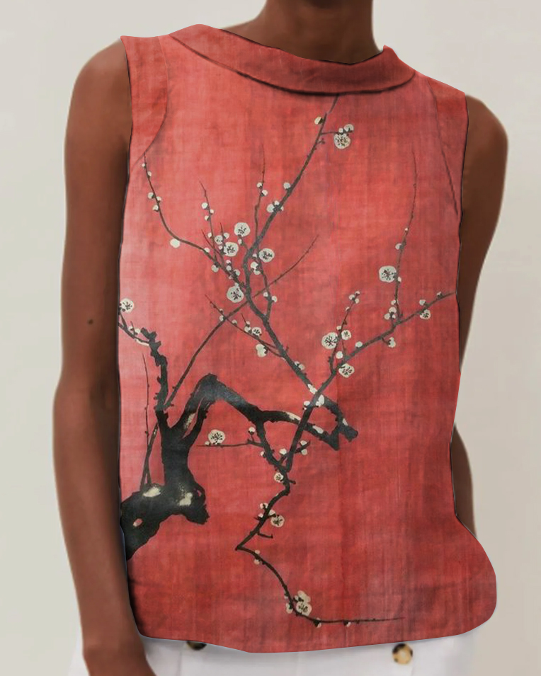 Vintage Plum Blossom Print Cotton and Linen Round Neck Sleeveless Top