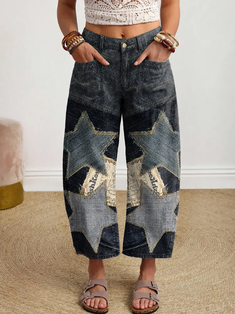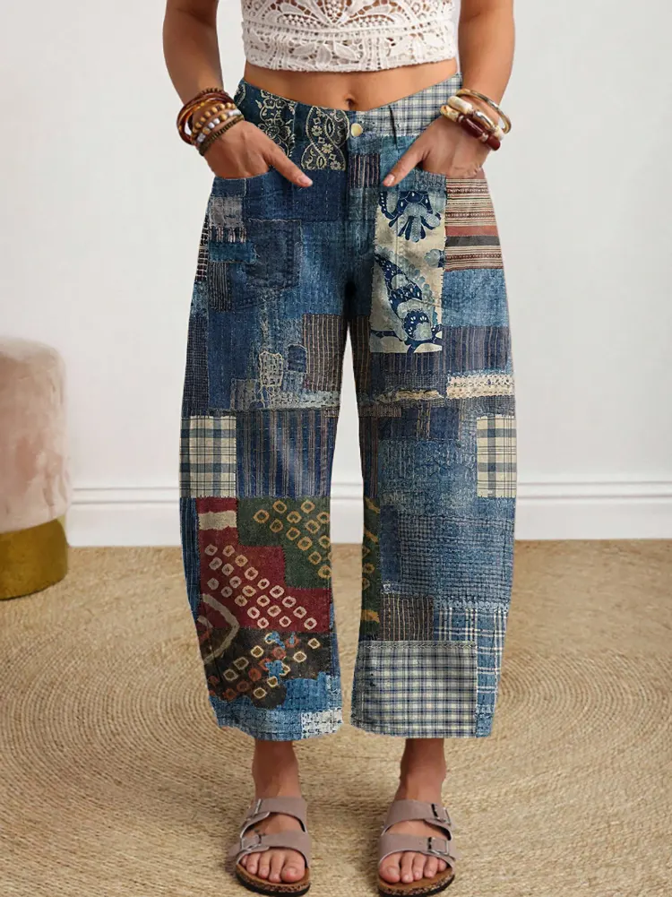 Women's Bohemian-style Patchwork Art Print Casual Cotton Trousers With Pockets.