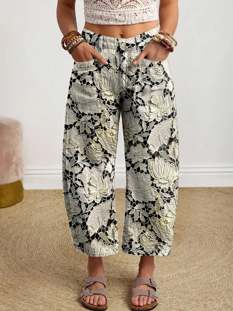 Women's Vintage-style Textured Floral Art Print Casual Cotton Trousers With Pockets.