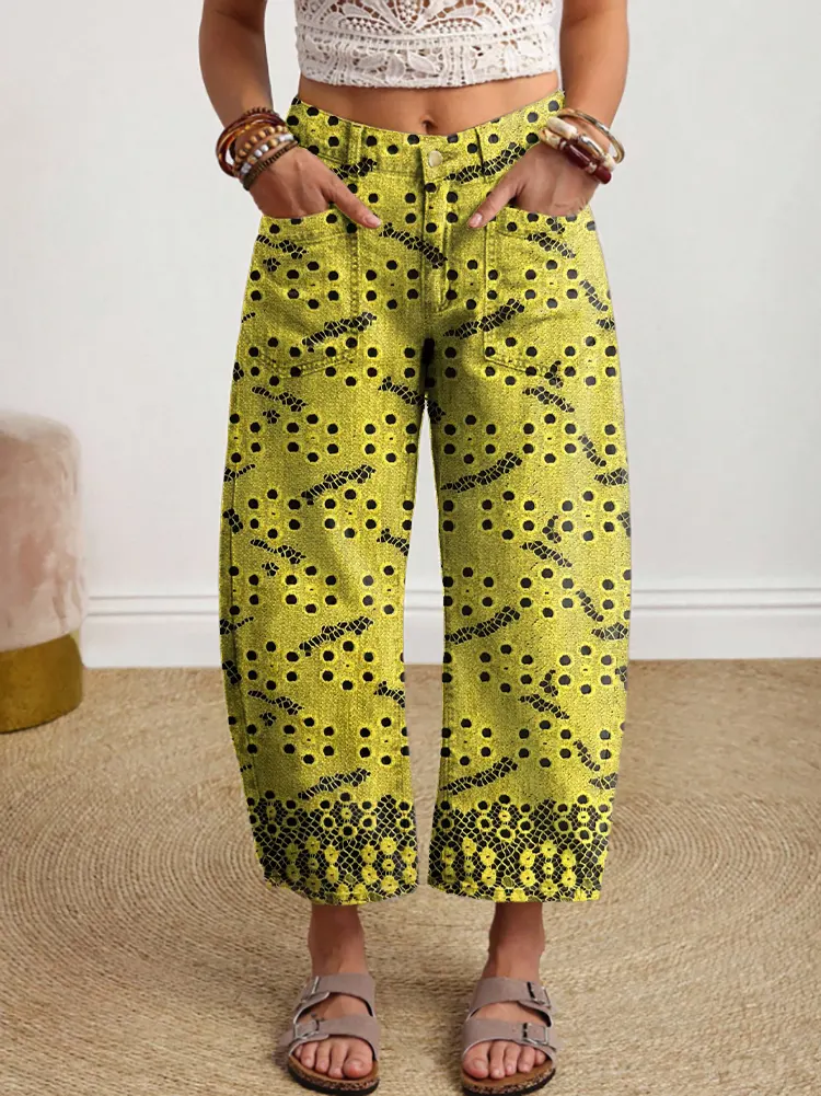 Women's Vintage-style Textured Art Print Casual Cotton Trousers With Pockets.