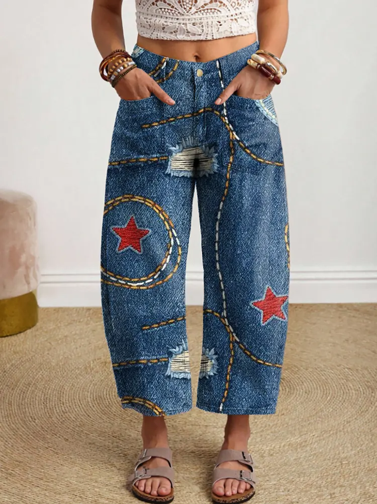 Women's Vintage Star-patterned Art Print Denim Jeans