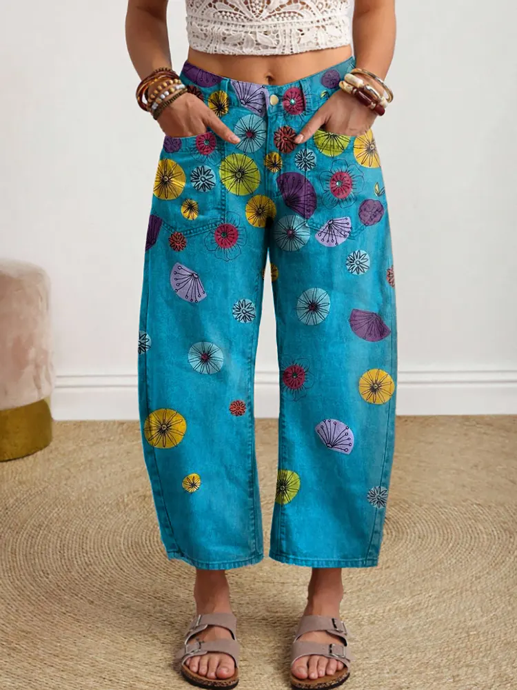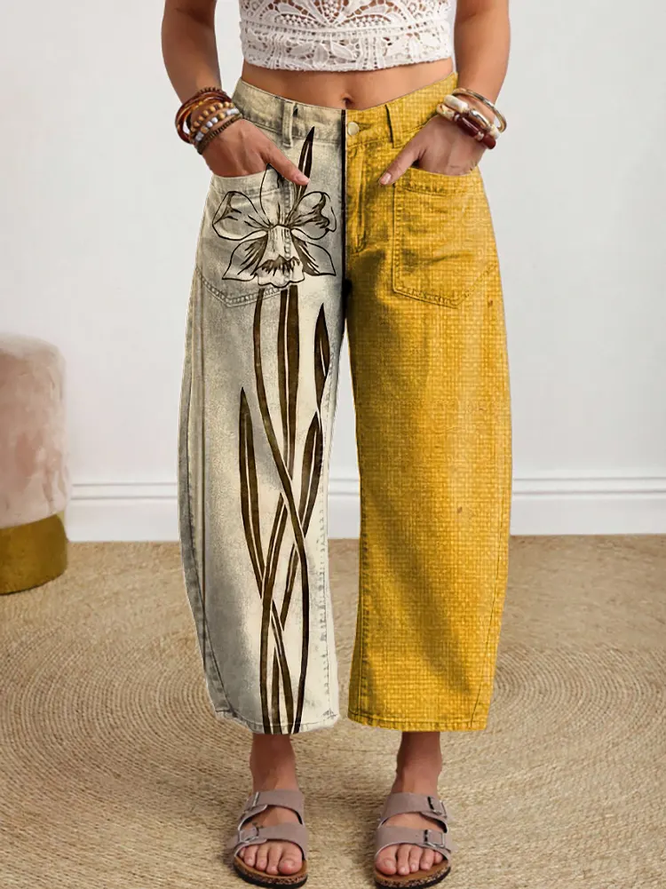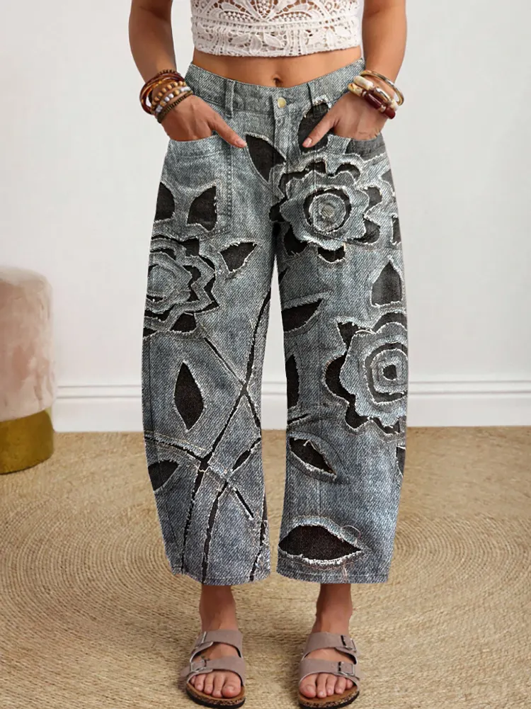 Women's Retro Floral Art Print Casual Washed Cotton Jeans