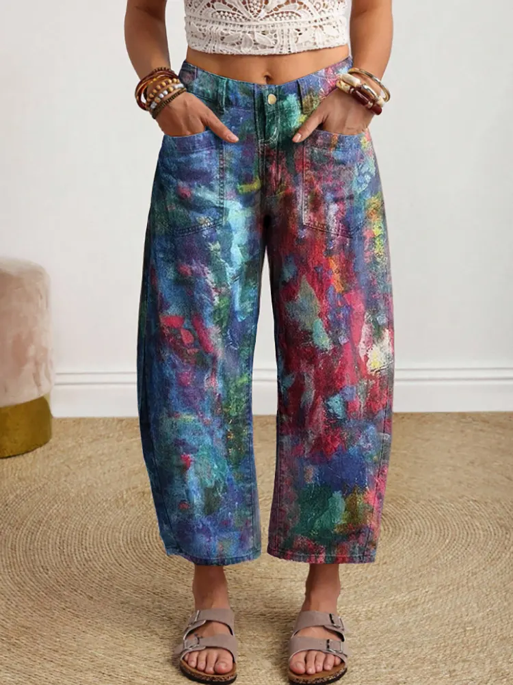 Women's Oil Painting Texture Art Print Casual Washed Cotton Denim Jeans
