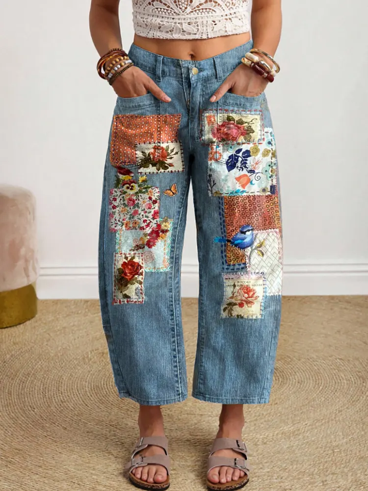 Women's Bohemian Patchwork Floral Art Print Denim Jeans