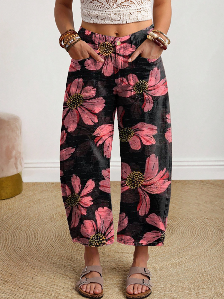 Women's Vintage Daisy Floral Art Print Casual Cotton Trousers With Pockets