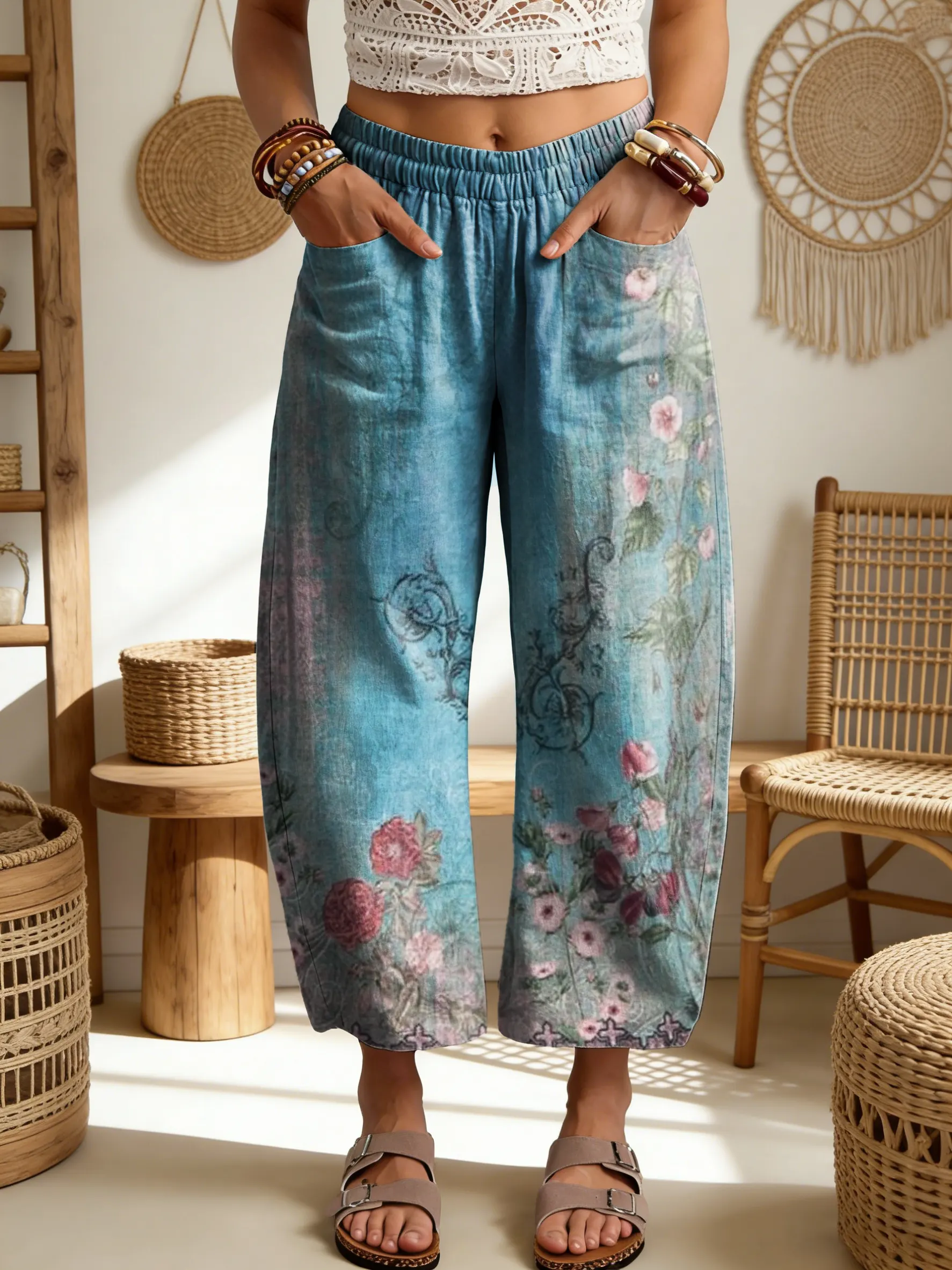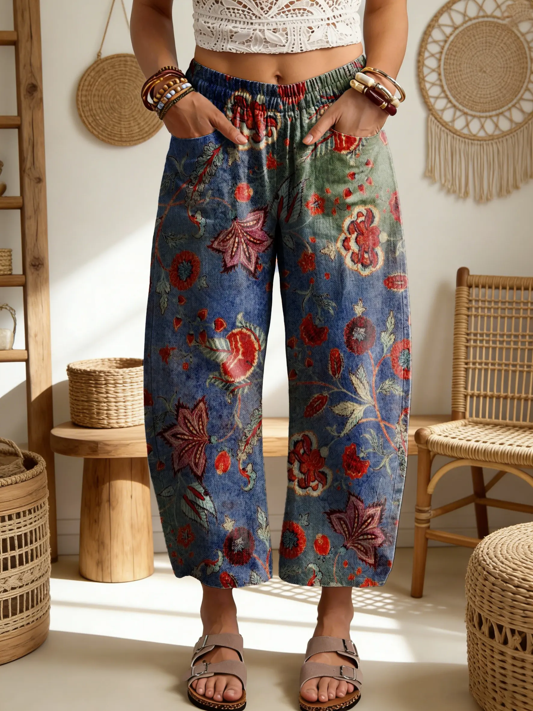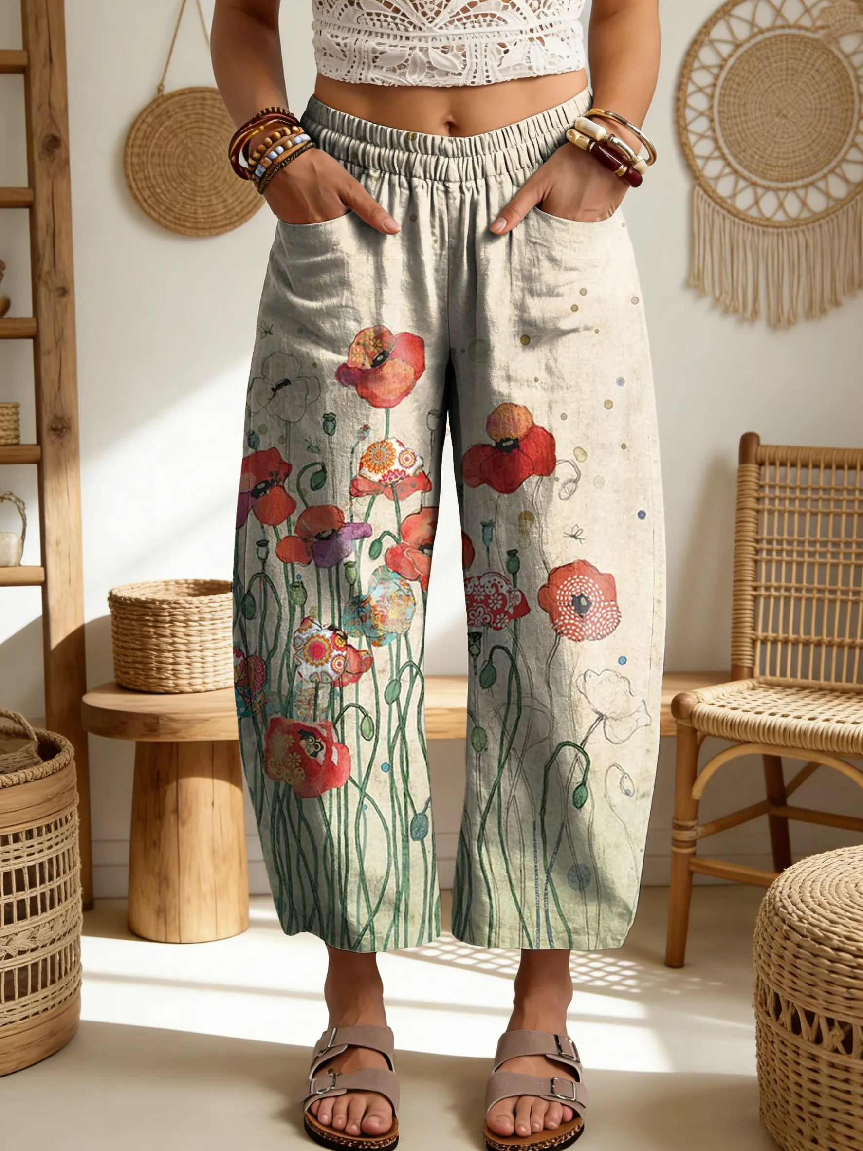 Women's Boho Floral Art Print Elastic Waist Pocket Cotton Pants