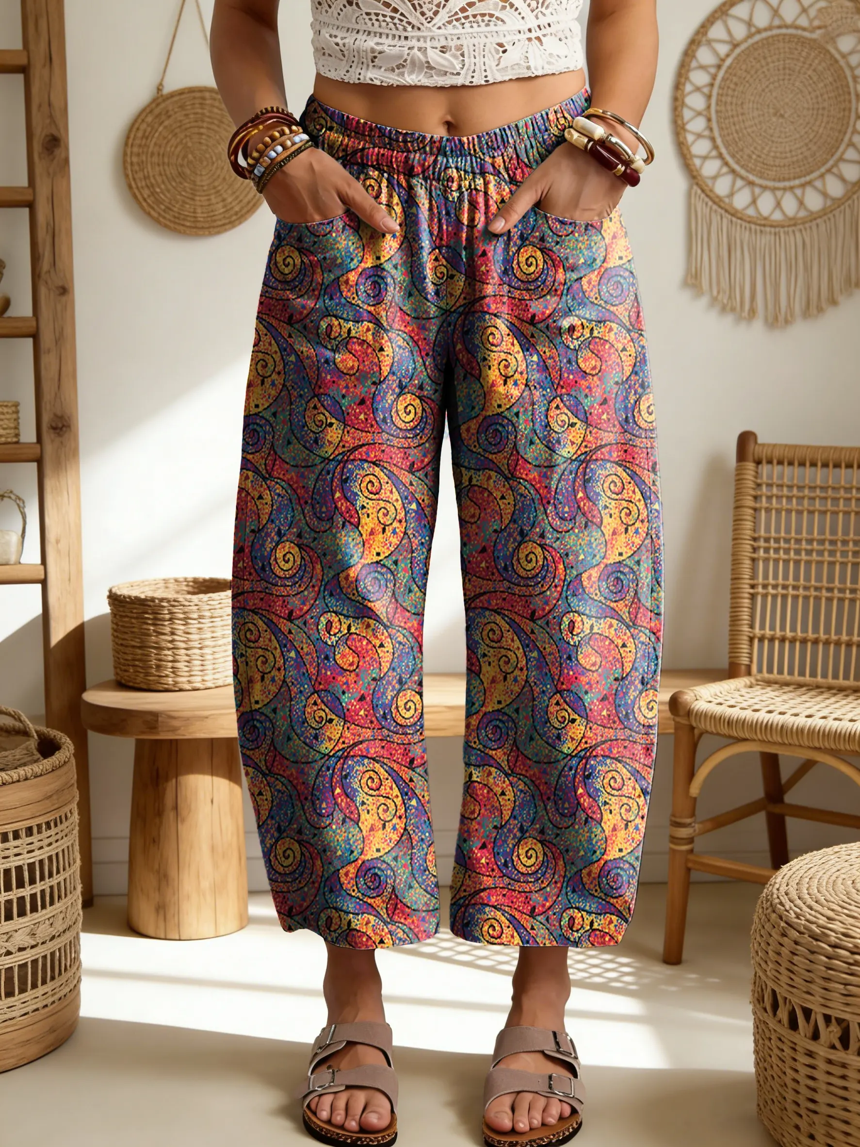 Women's Ethnic Art Print Elastic Waist Pocket Cotton Pants
