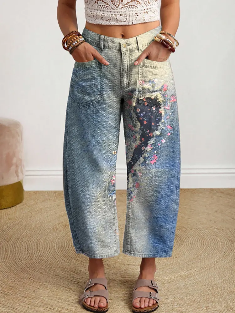 Women's Retro Floral Art Print Casual Washed Cotton Jeans