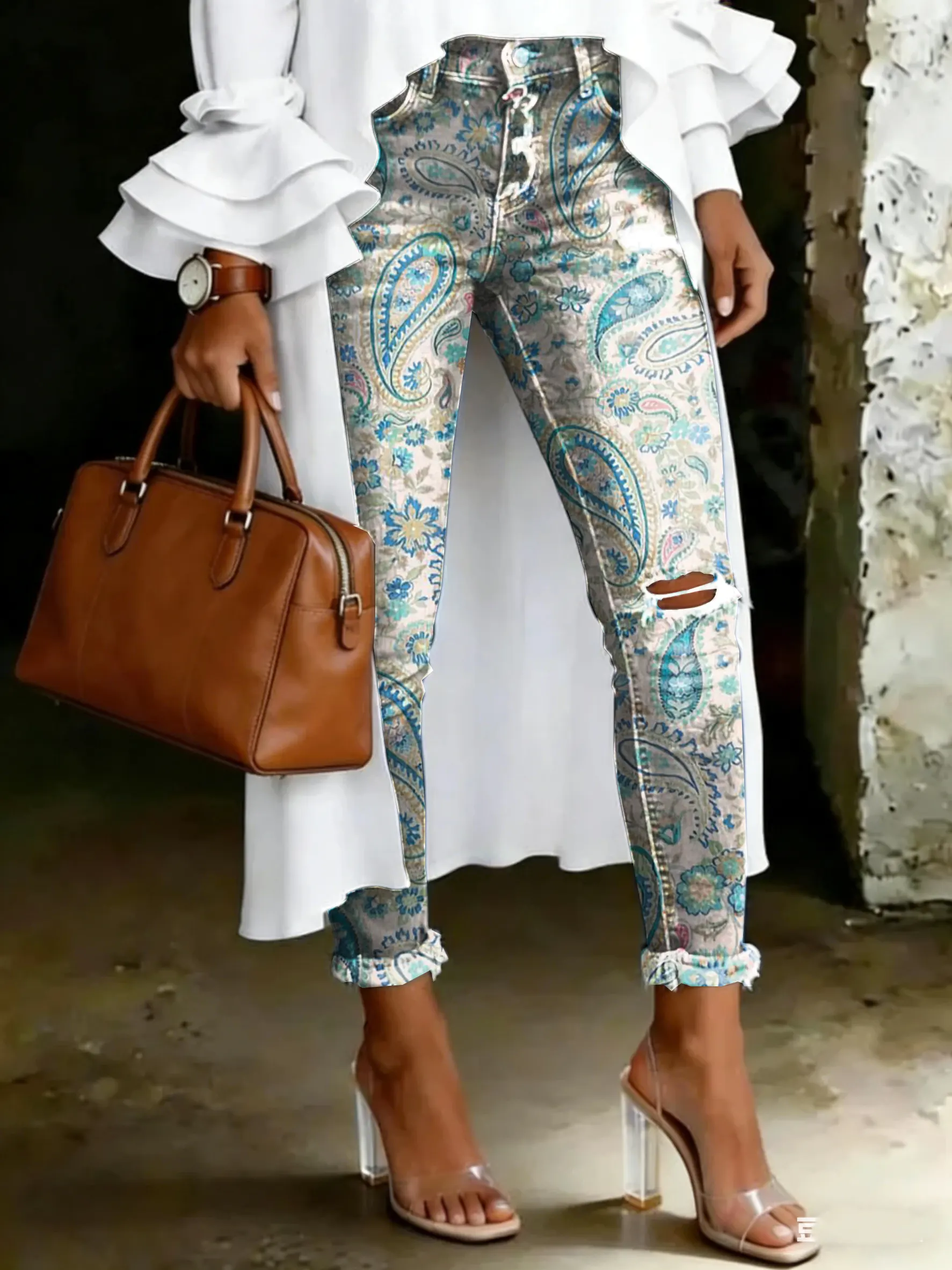 Women's Vintage Paisley Floral Print Casual High-waisted Ripped Skinny Jeans