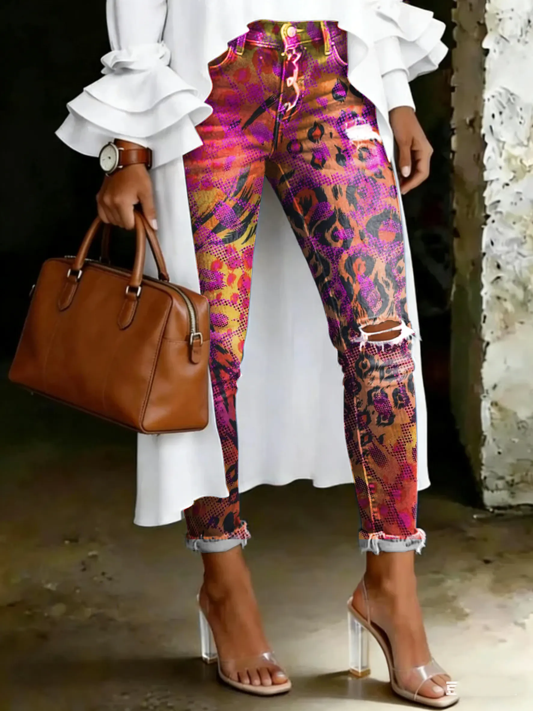 Women's Vintage Multicolor Leopard Print Casual High-waisted Ripped Skinny Jeans