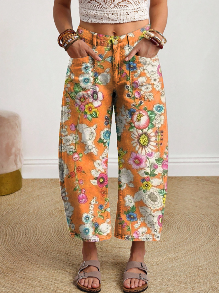 Women's Retro Colorful Floral Art Print Casual Pocket Cotton Pants