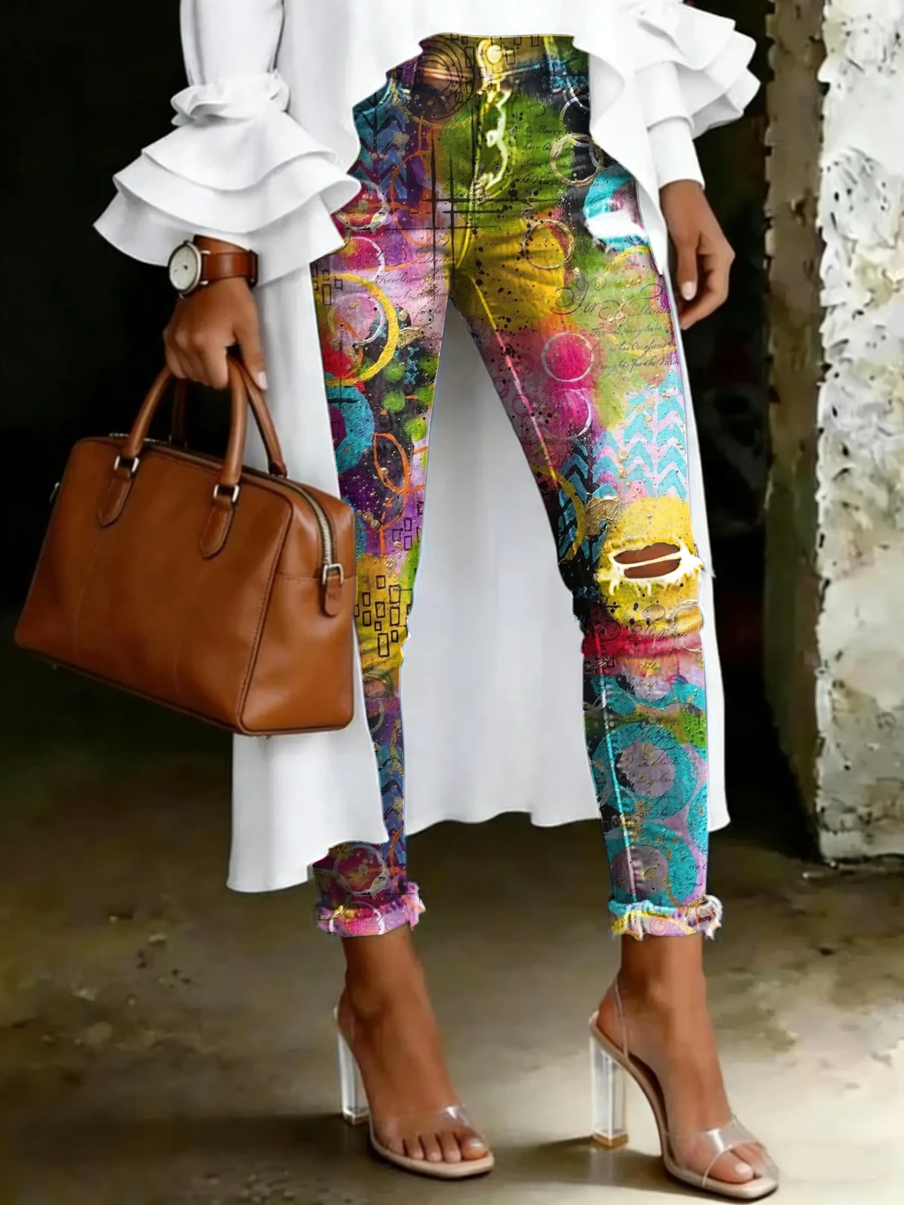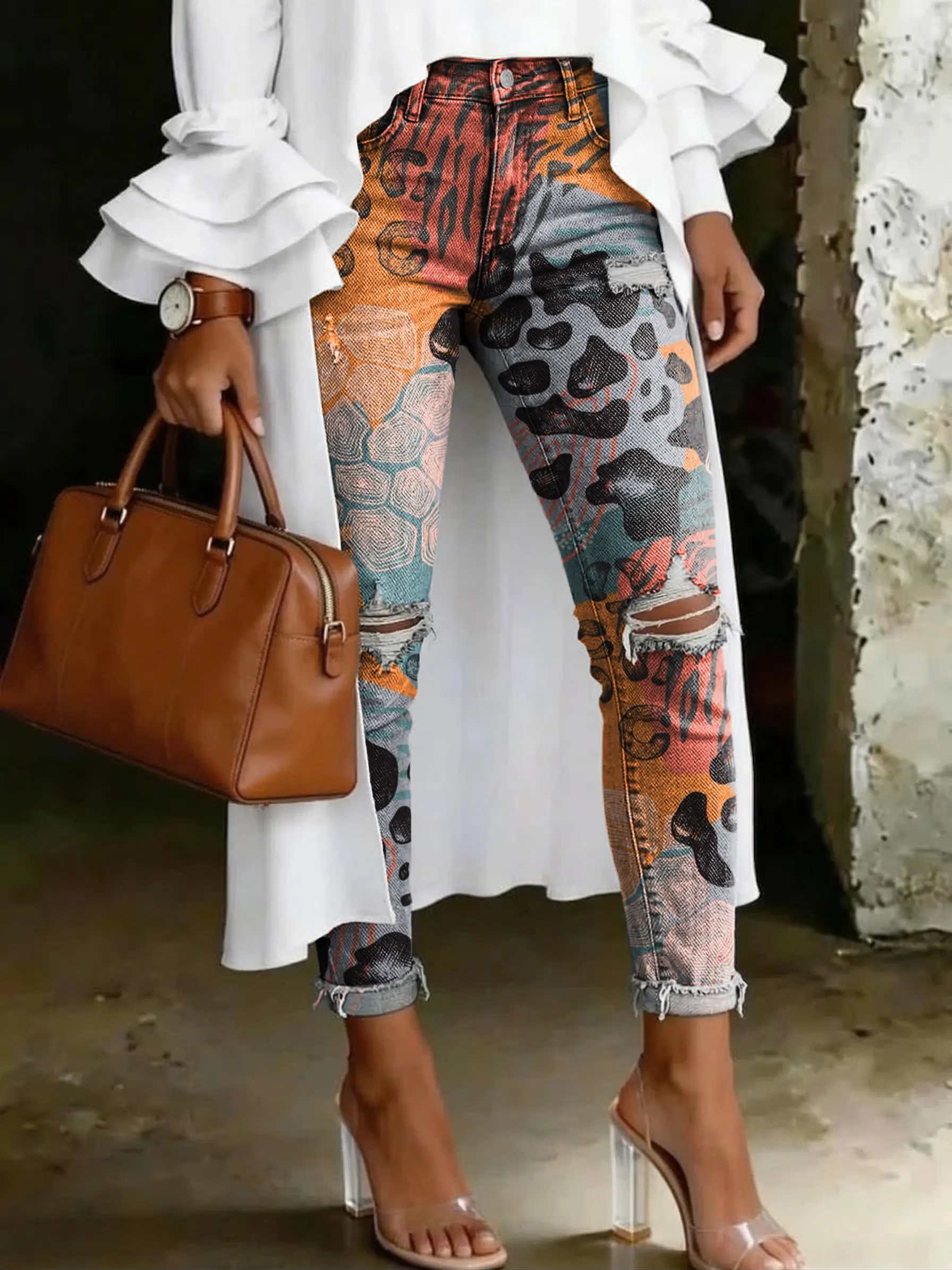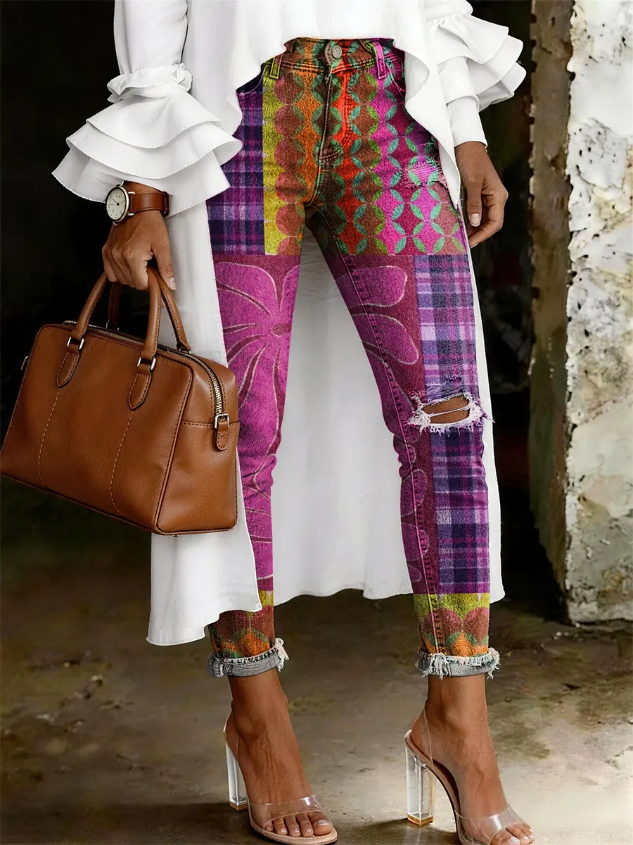 Women's Vintage Multicolor Print Casual High-waisted Ripped Skinny Jeans