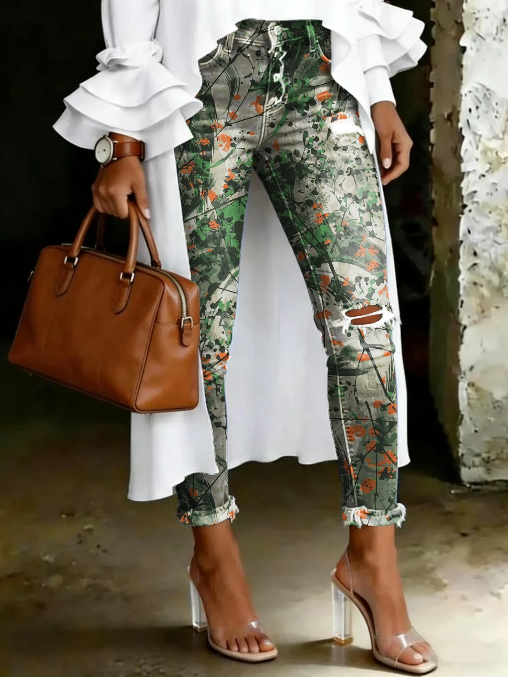 Women's Vintage Leaves Print Casual High-waisted Ripped Skinny Jeans