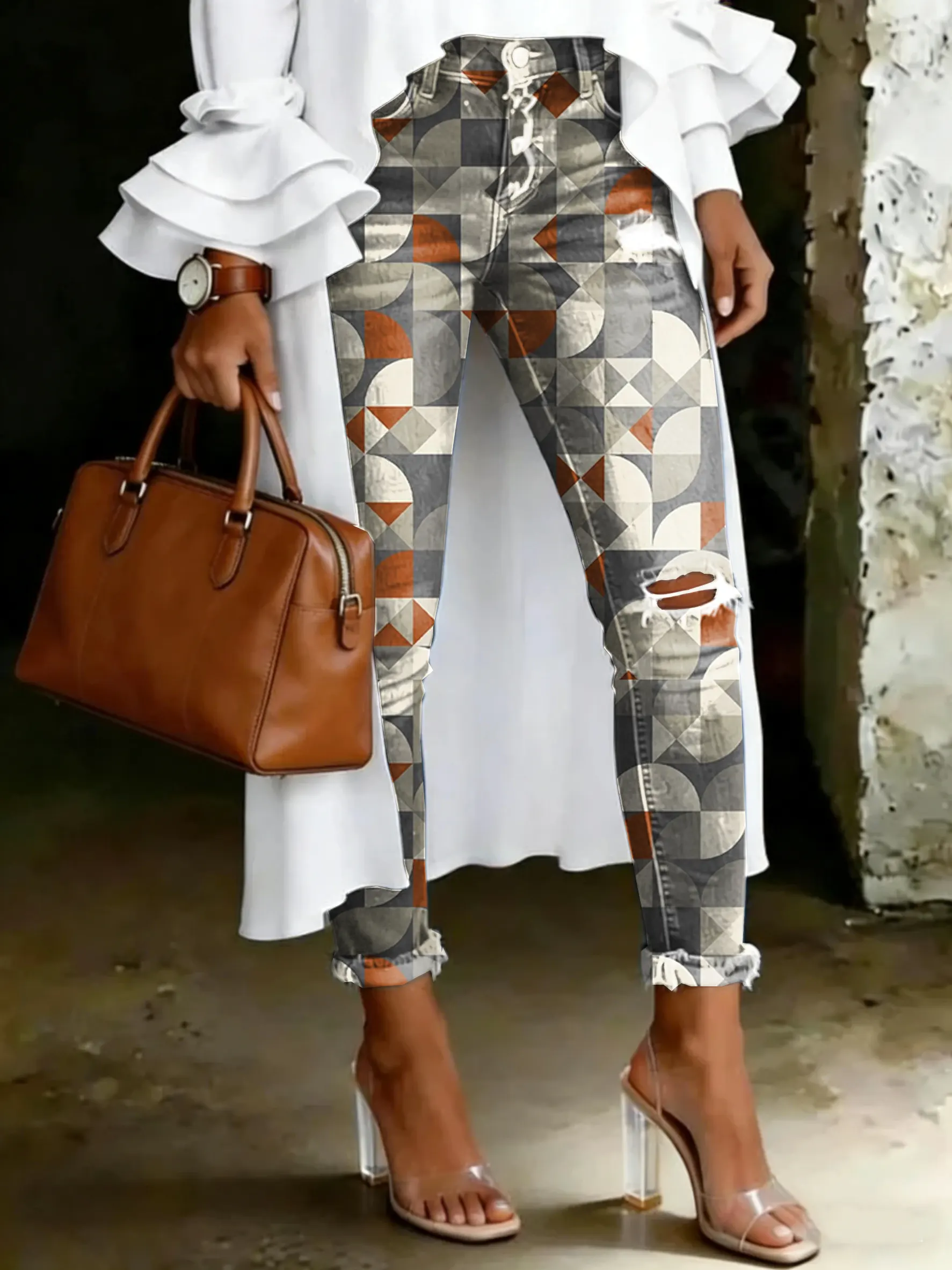Gradient Geometric Patterns Casual Printed Ripped Skinny Jeans