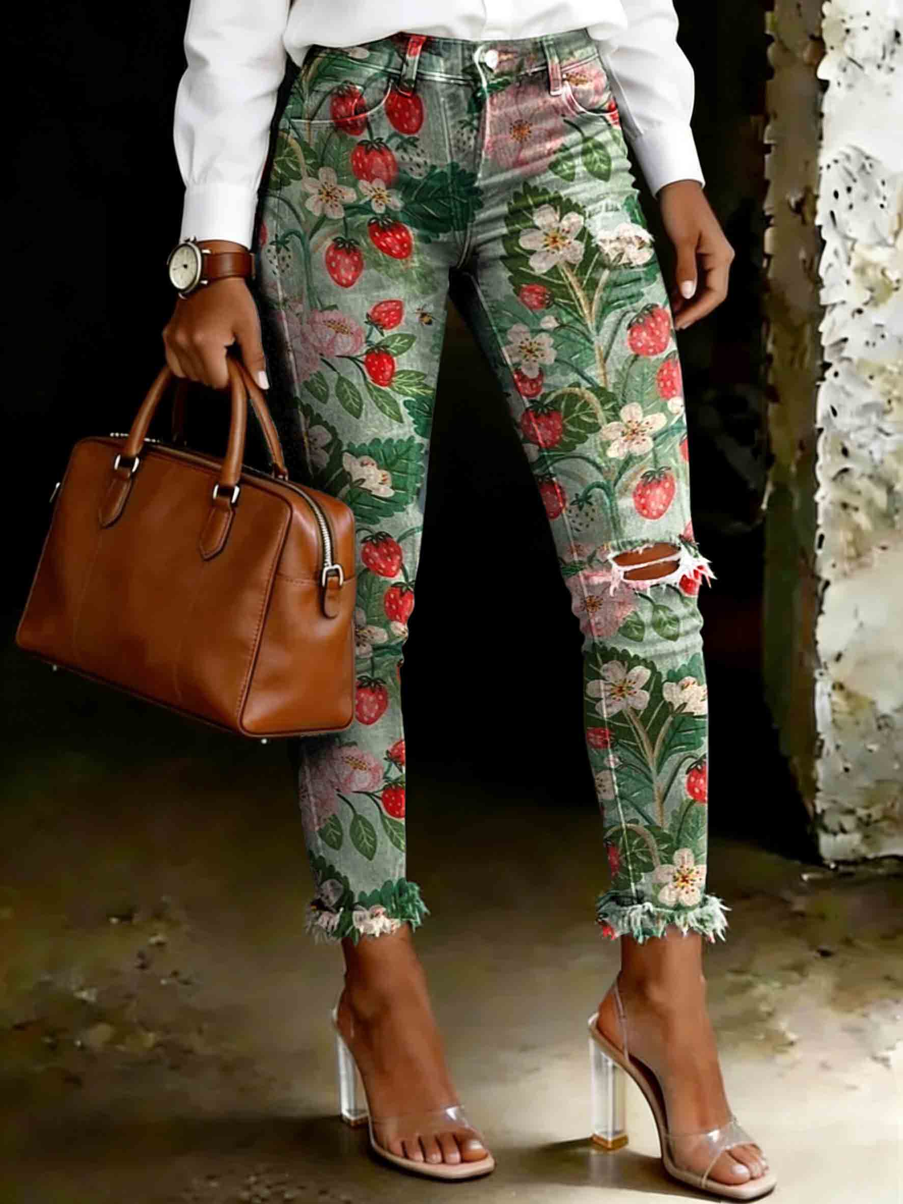 Women's Vintage Strawberry Art Print Ripped Skinny Jeans