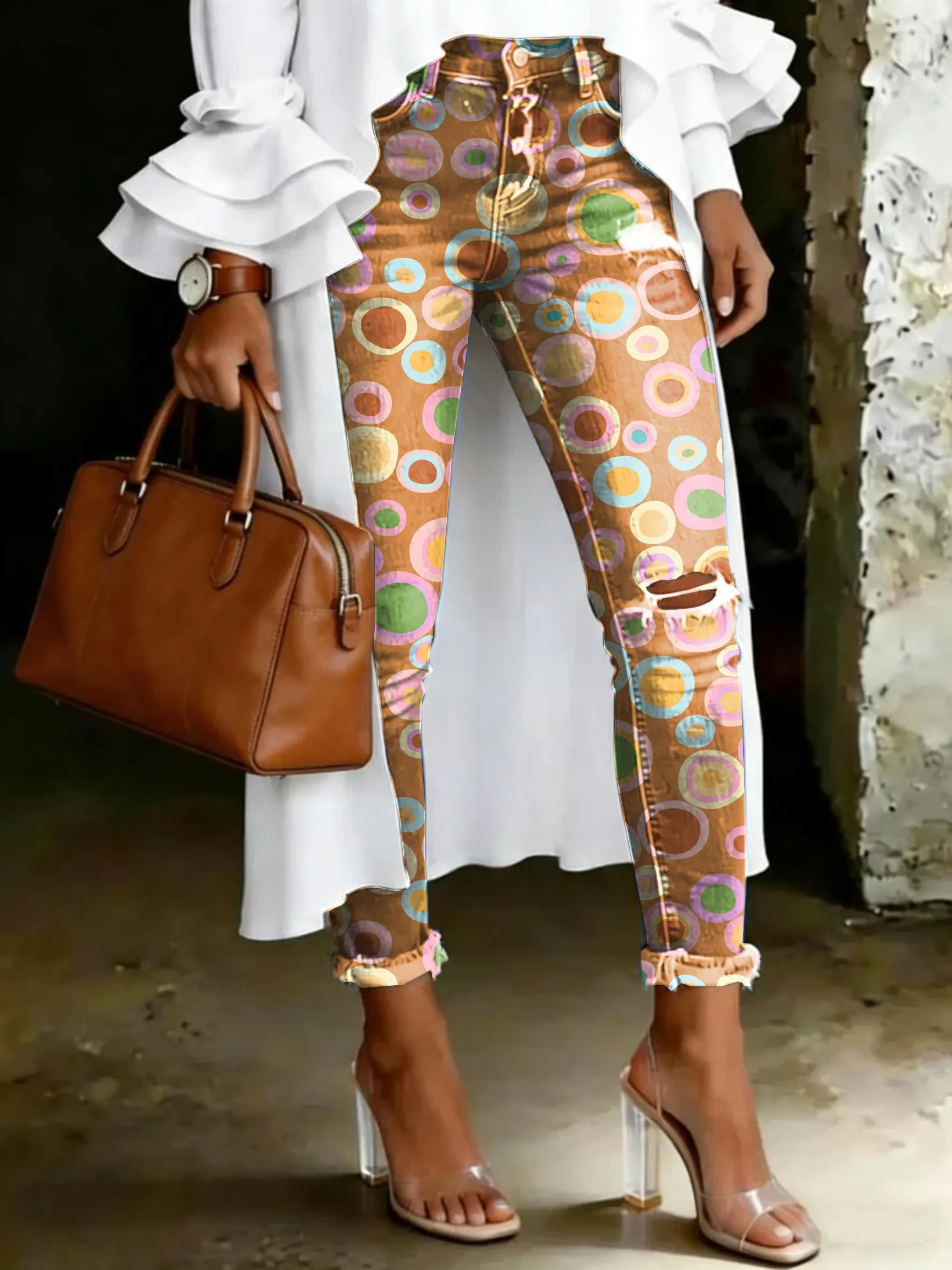 Women's Vintage Multicolor Polka Dots Print Casual High-waisted Ripped Skinny Jeans