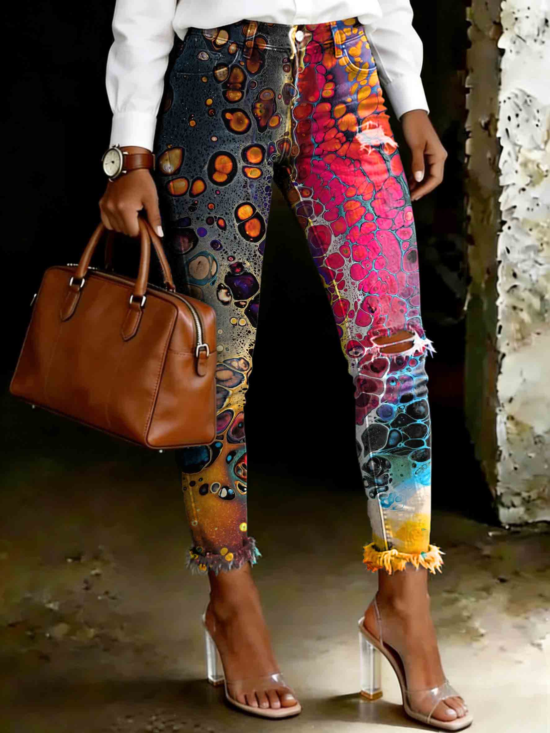 Colorful Gradient Geometric Casual-print Ripped Skinny Jeans