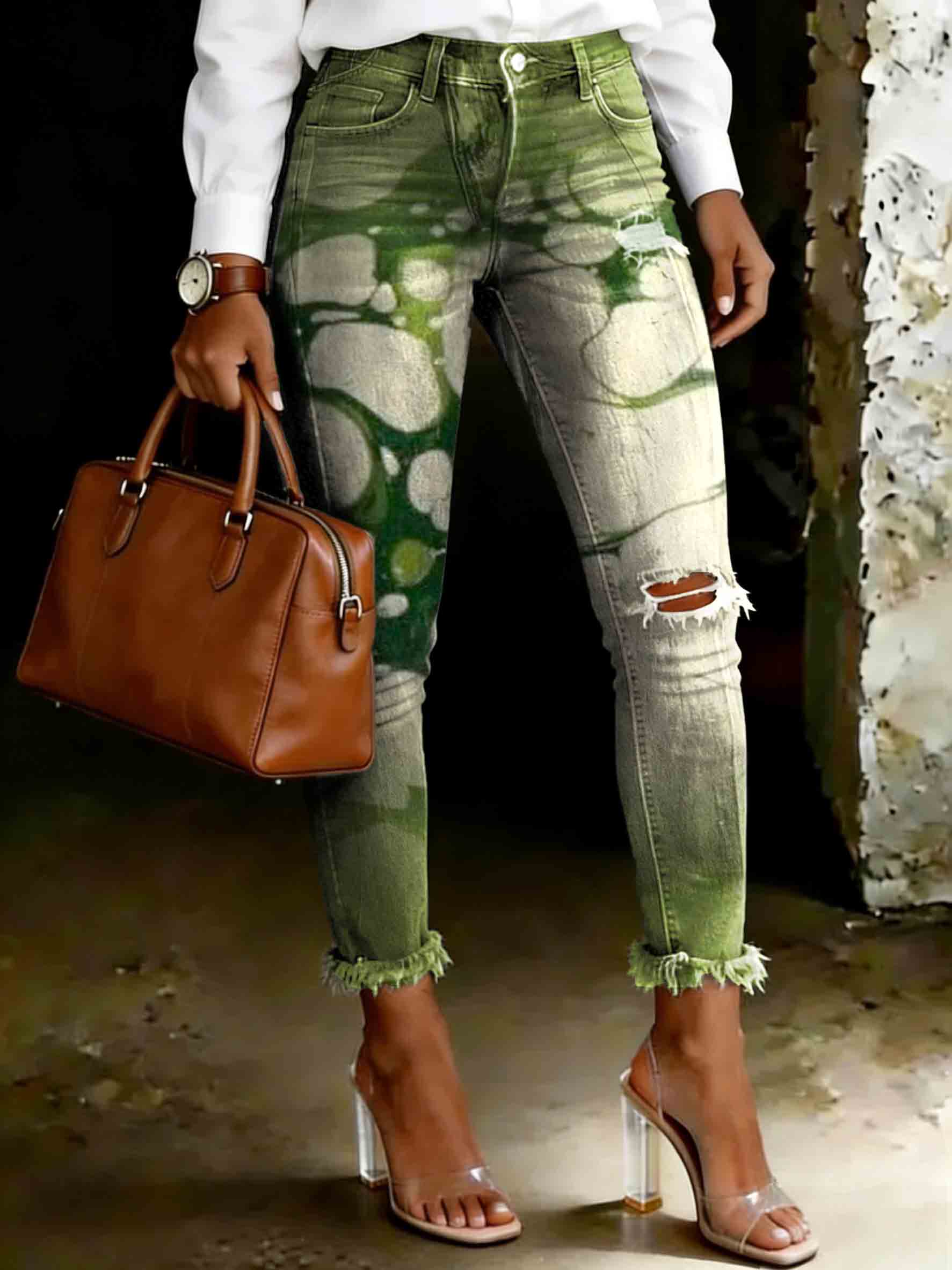 Women's Retro Green Gradient Water Pattern Art Print Ripped Skinny Jeans