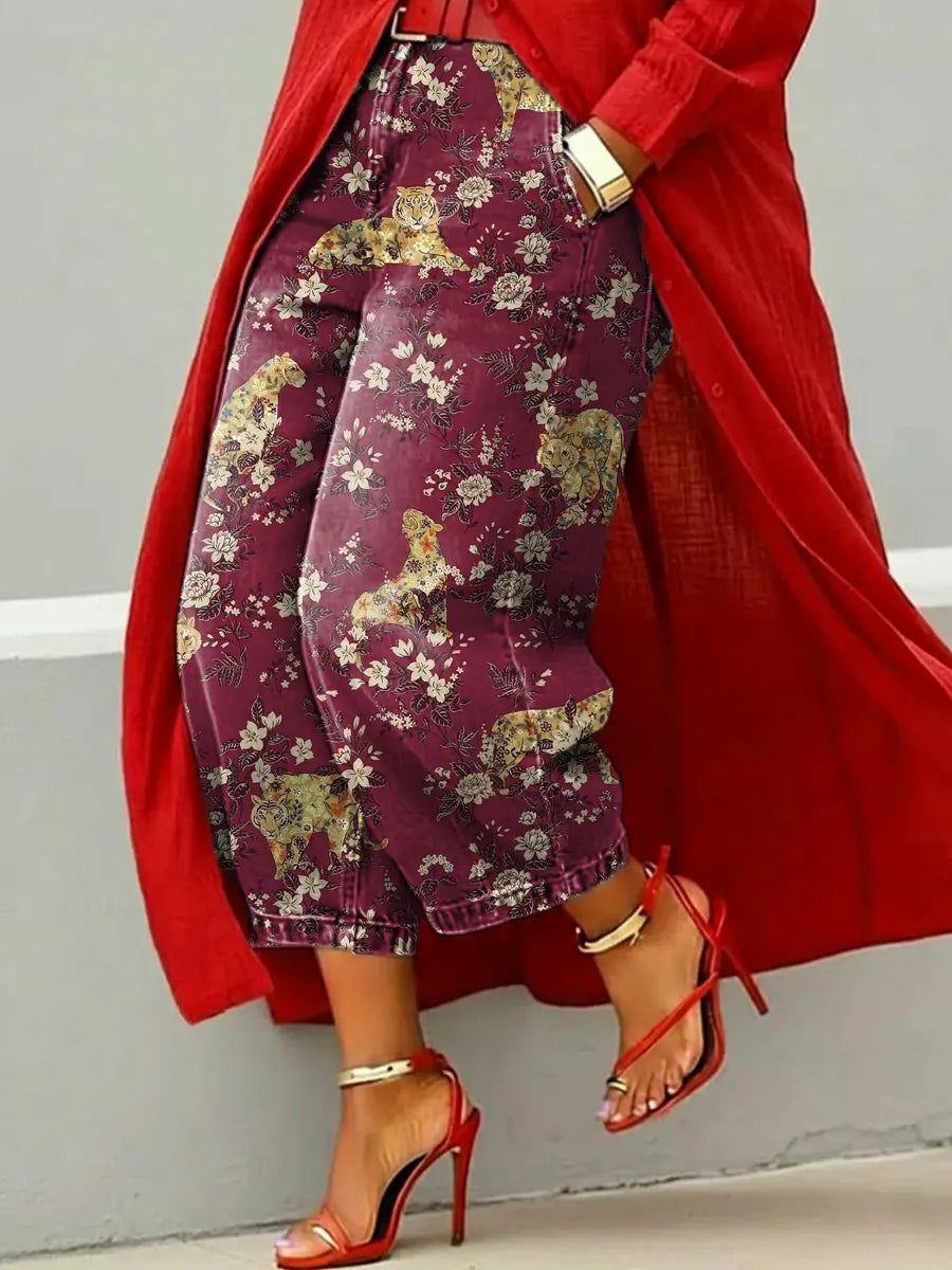 Women's Retro Tiger Pattern Art Print Casual Jeans