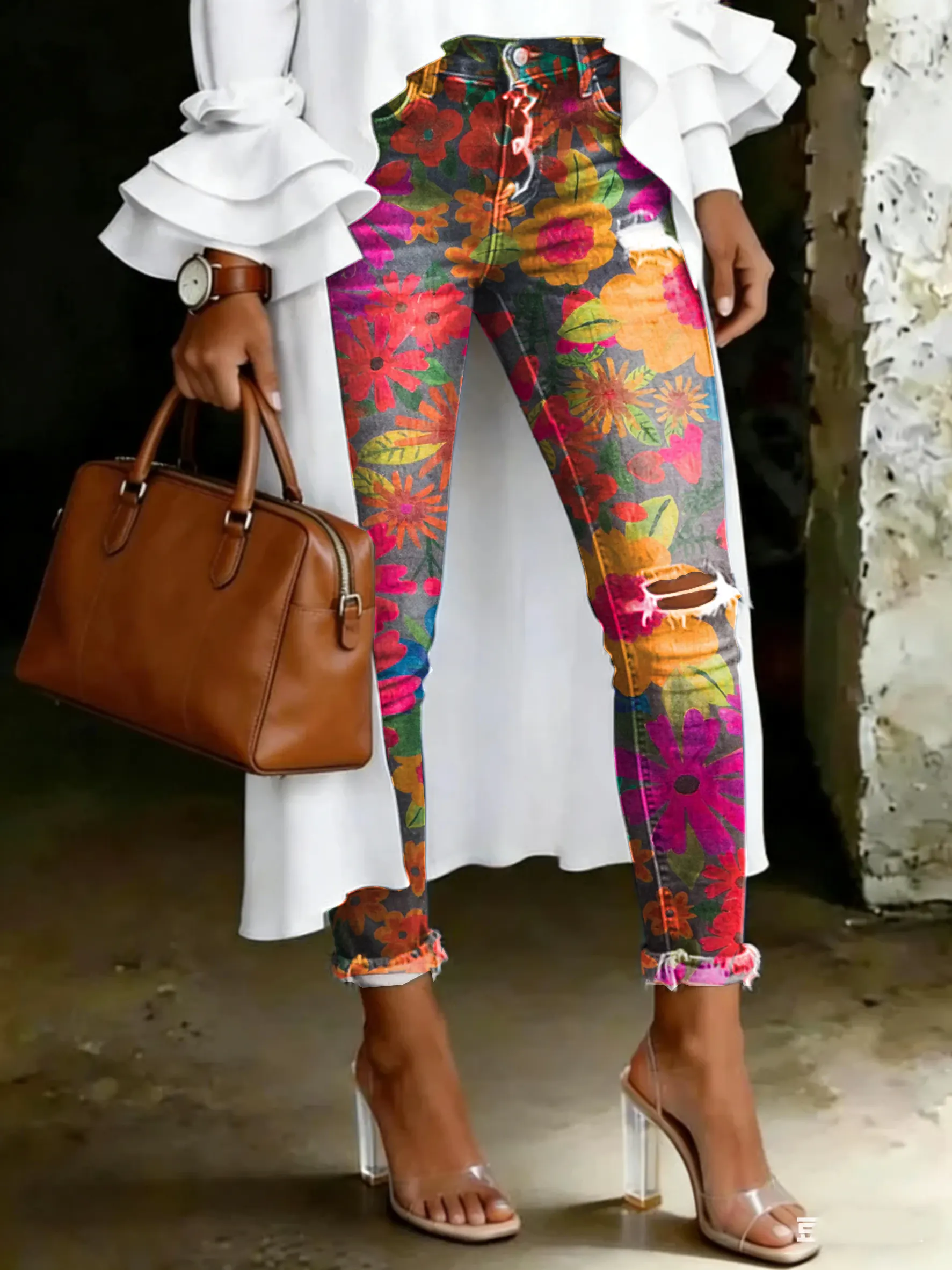 Women's Vintage Multicolor Floral Print Casual High-waisted Ripped Skinny Jeans