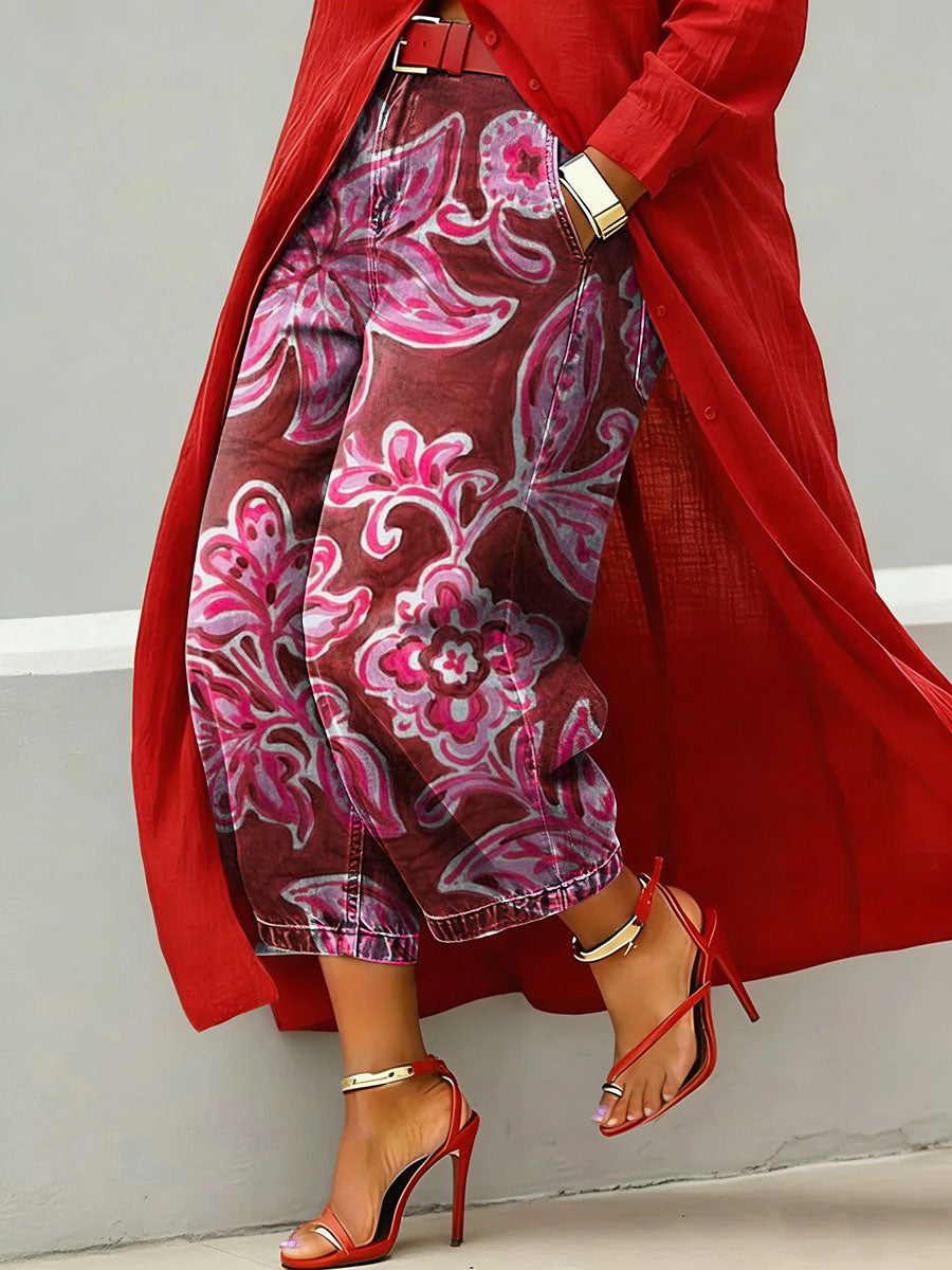 Women's Retro Floral Pattern Art Print Casual Jeans