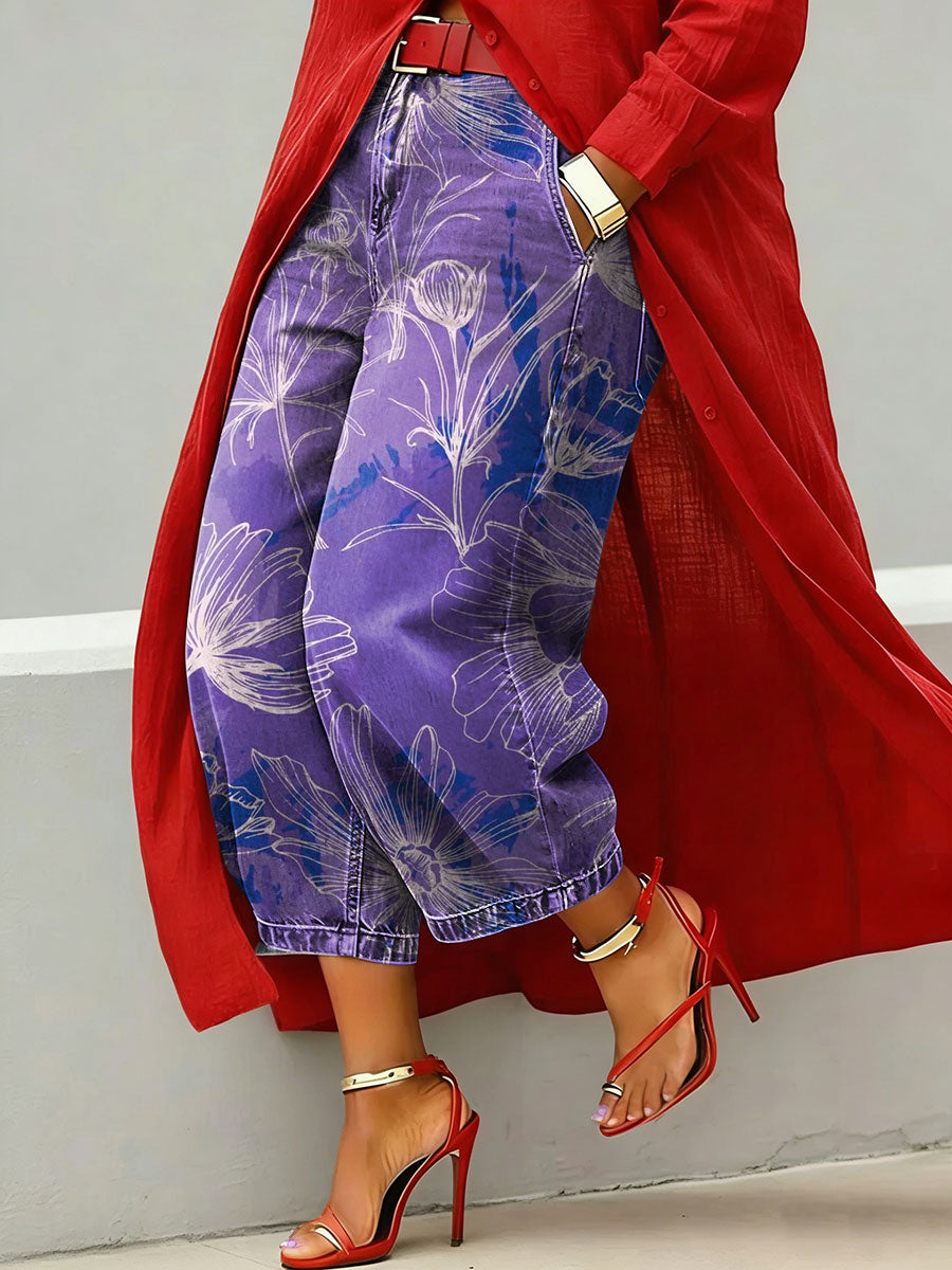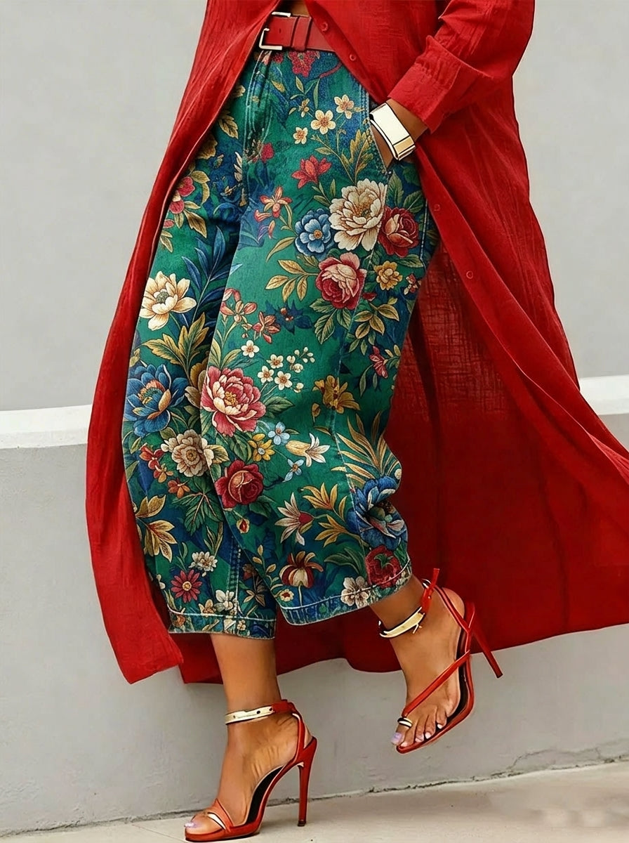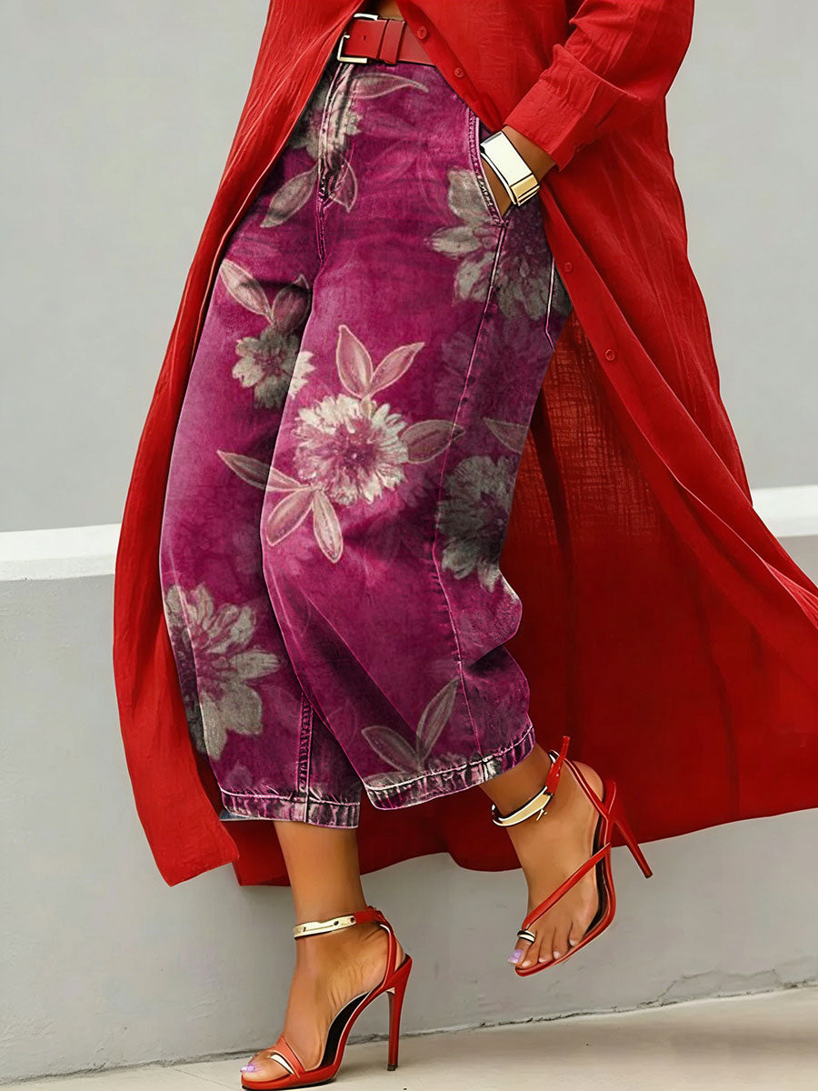 Elegant Oil Painting-style Floral Decorative Pattern Women's Denim Pants