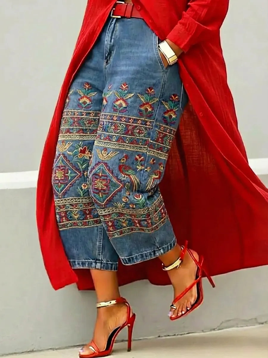 Women's Retro Ethnic Birds Pattern Art Print Casual Jeans