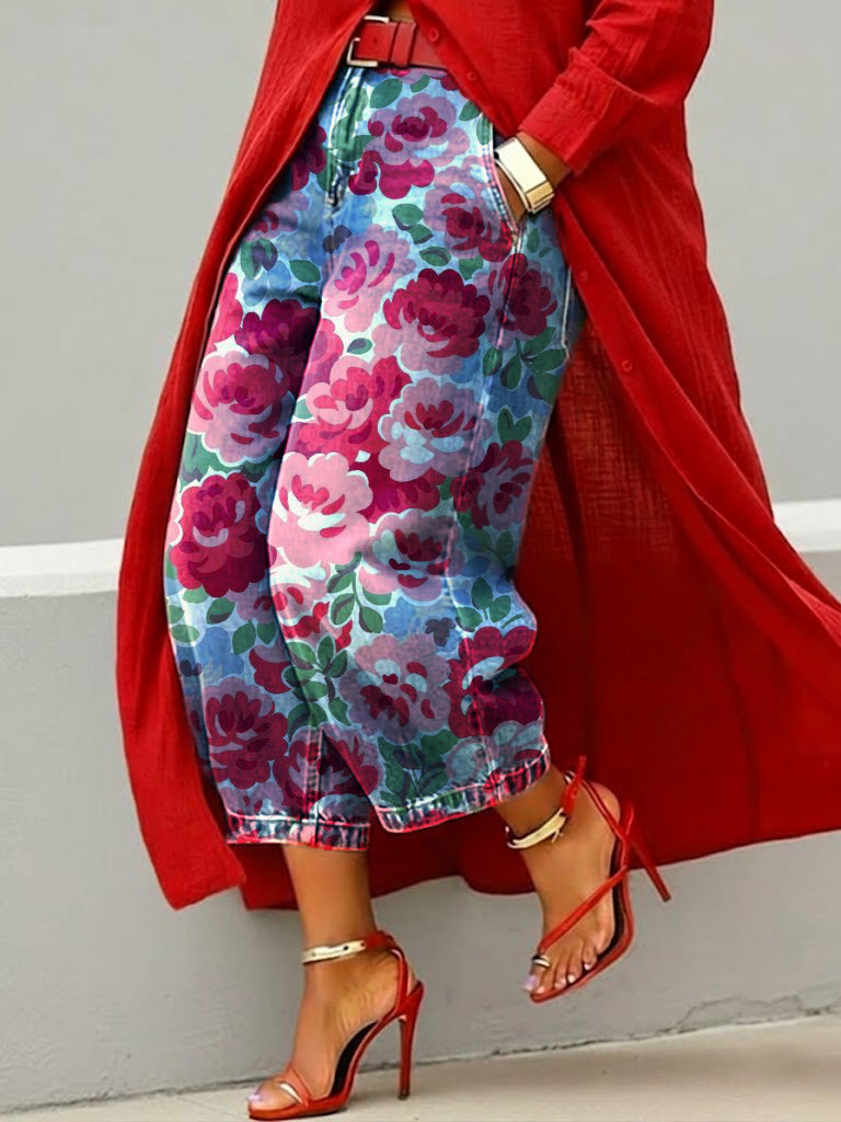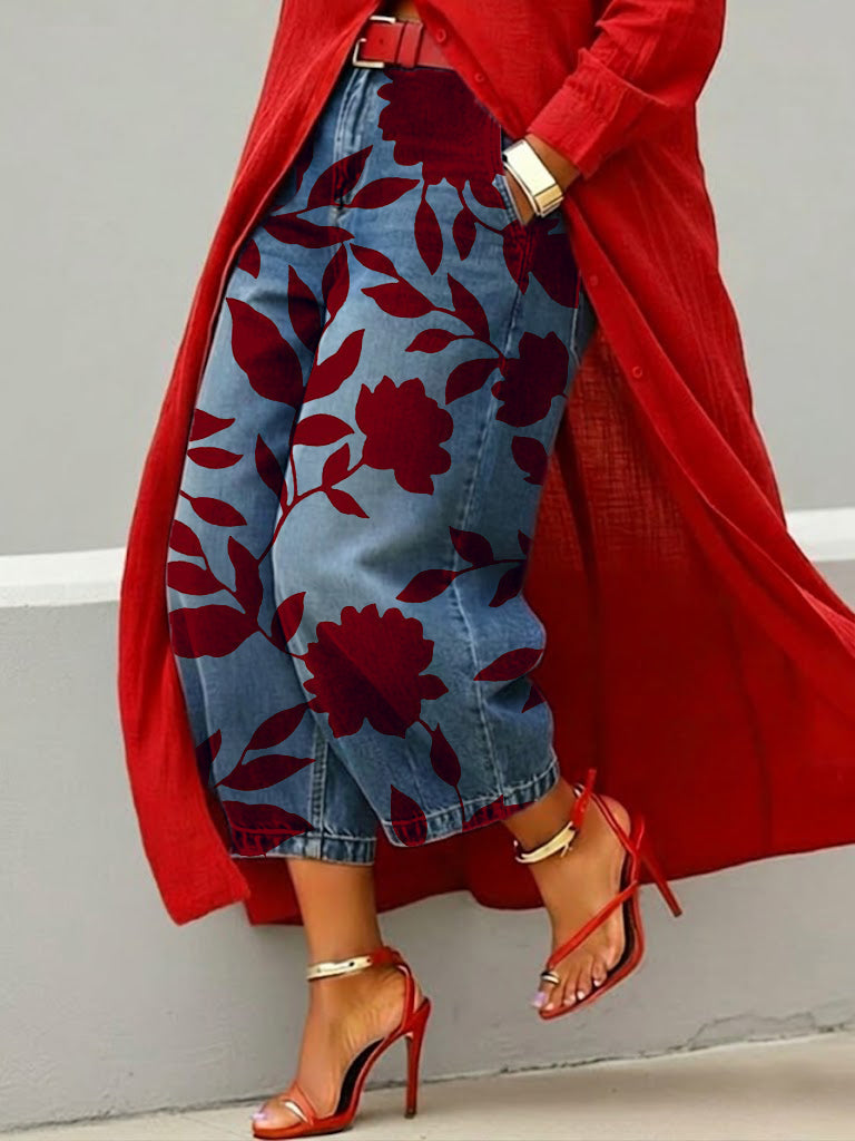 Women's Retro Floral Pattern Art Print Casual Jeans