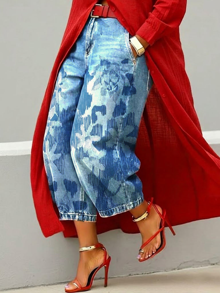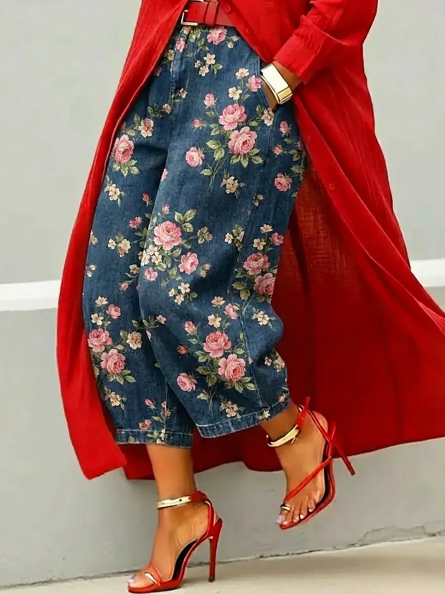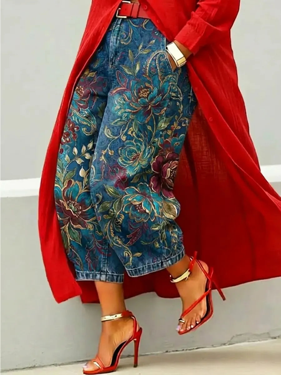 Women's Retro Floral Pattern Art Print Casual Jeans
