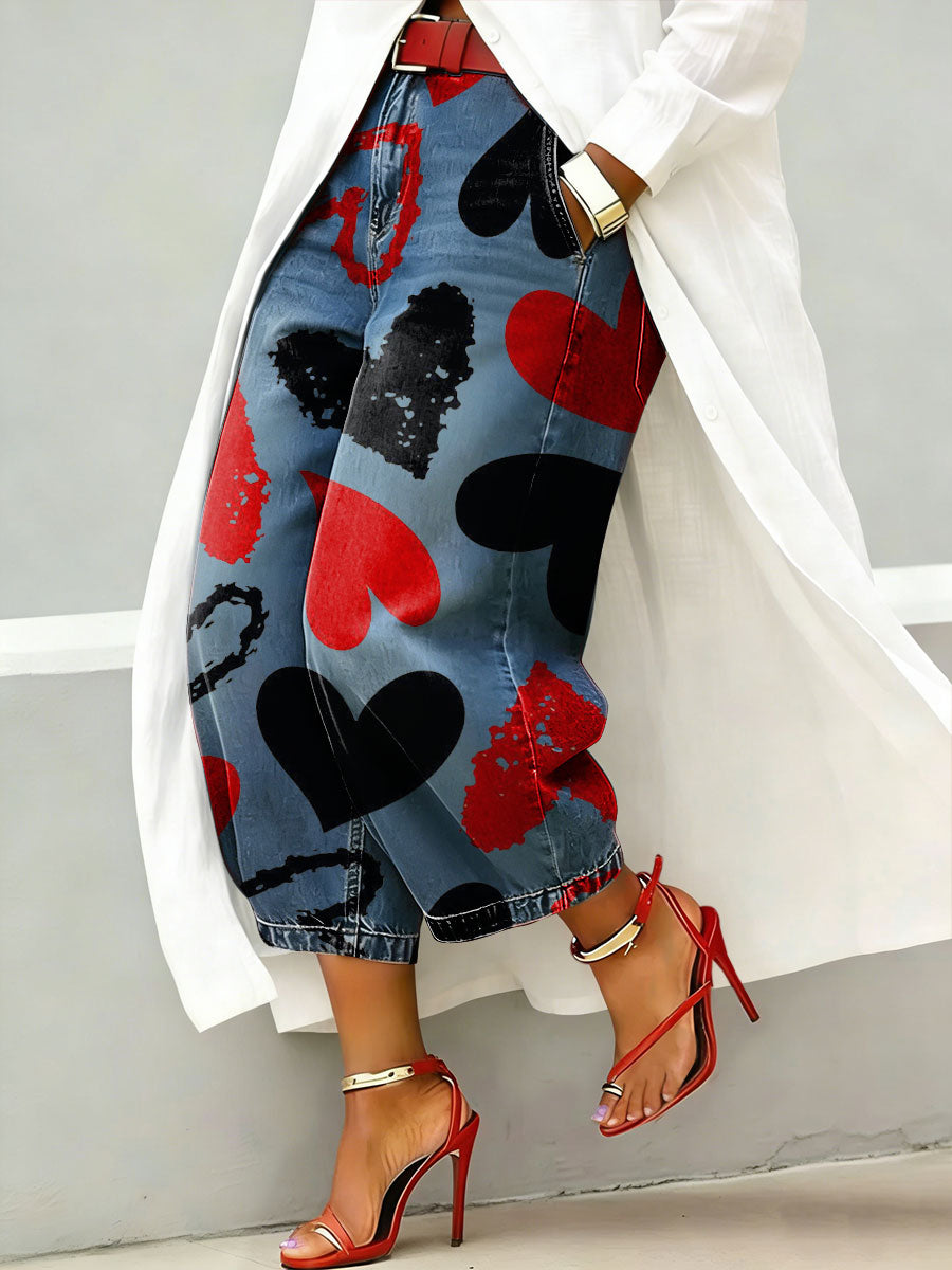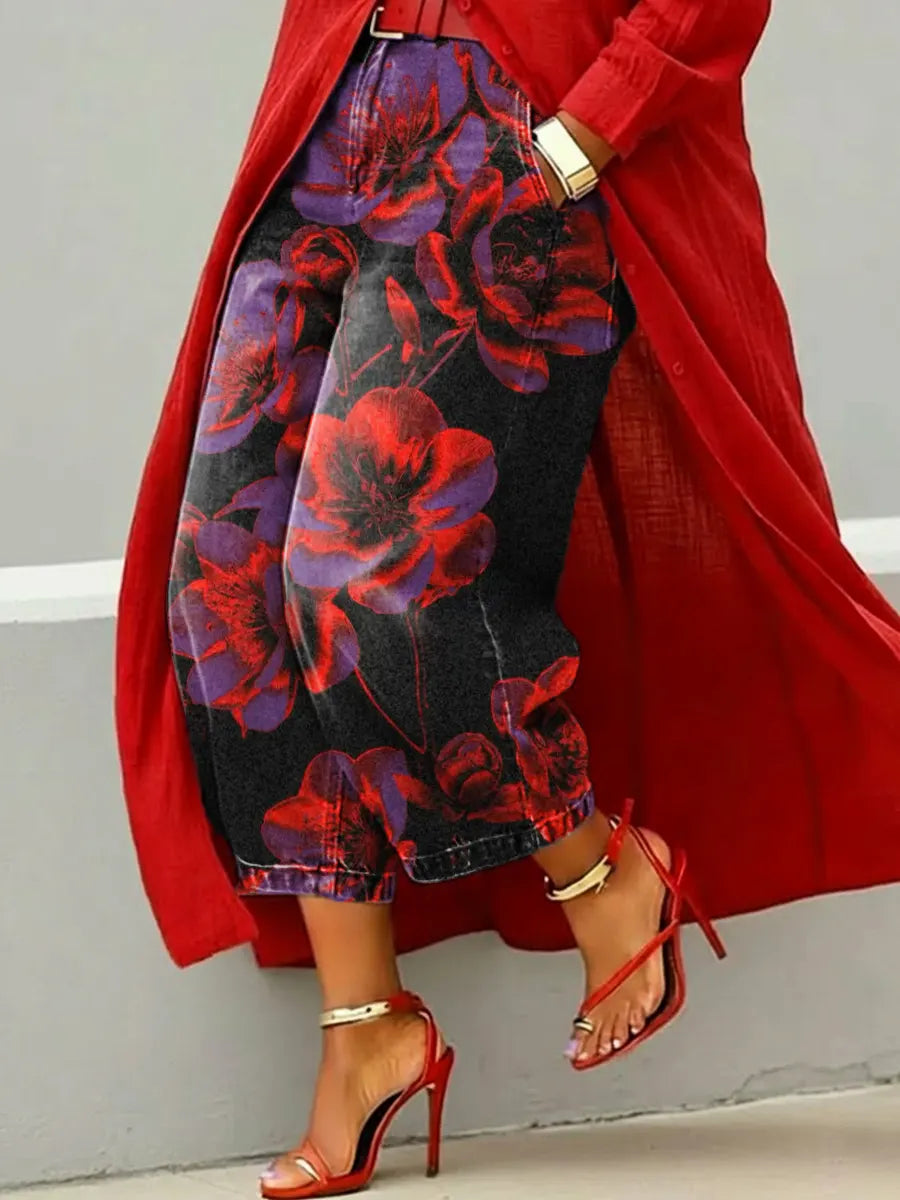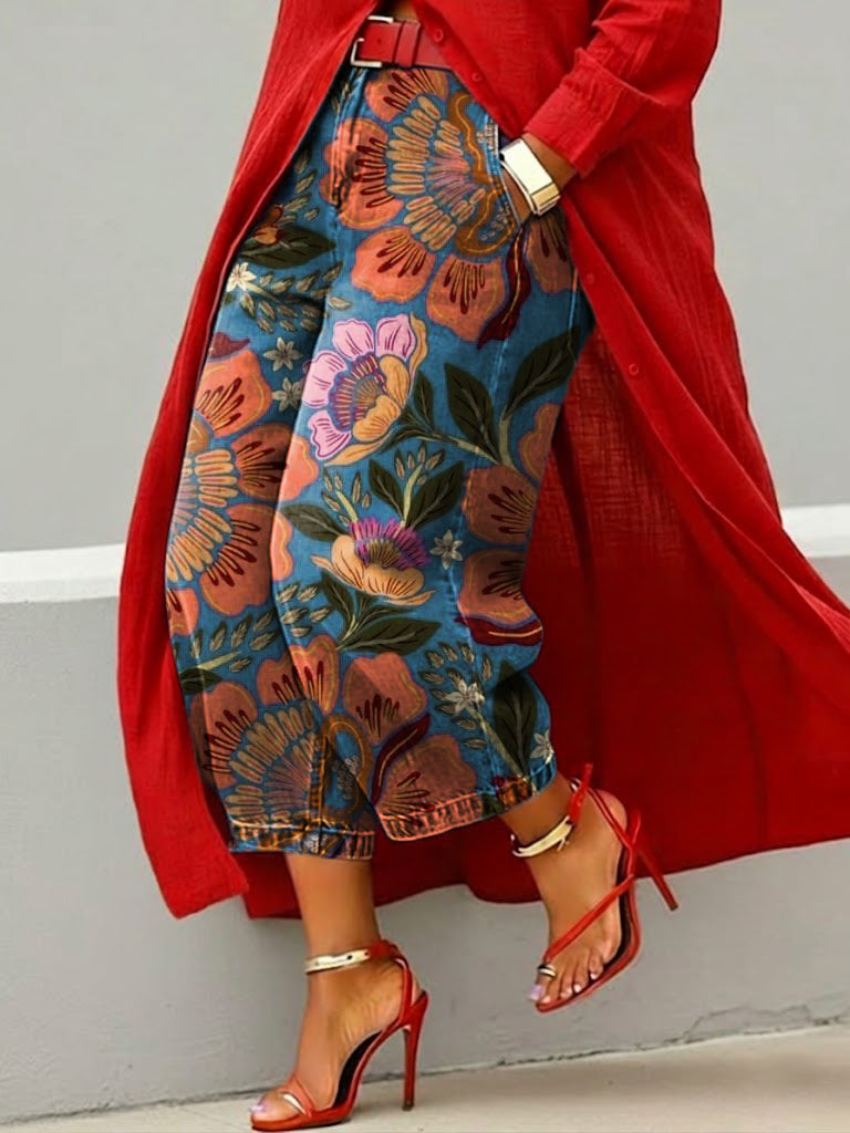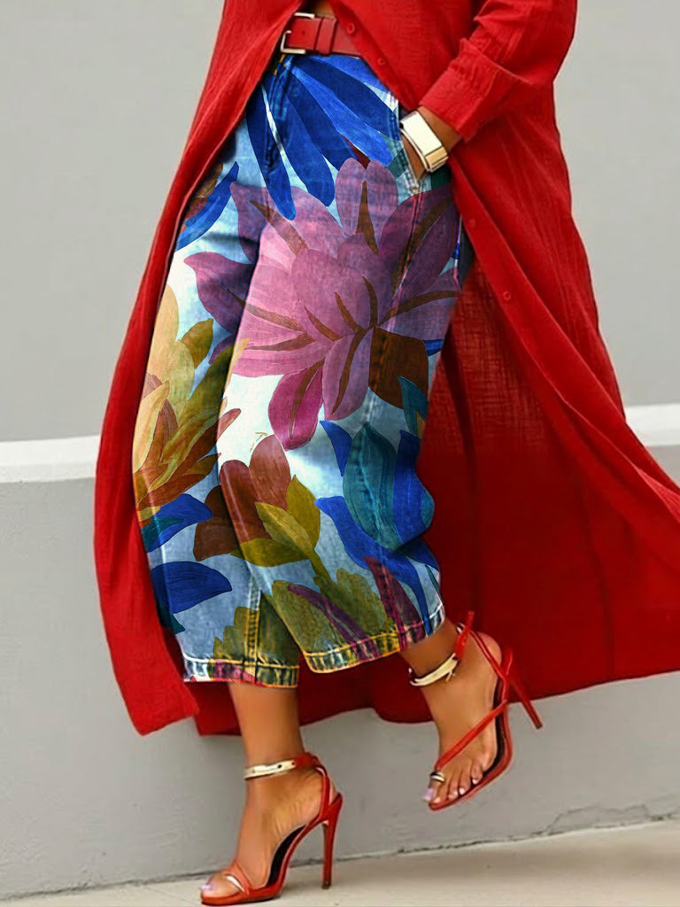 Women's Retro Floral Pattern Art Print Casual Jeans