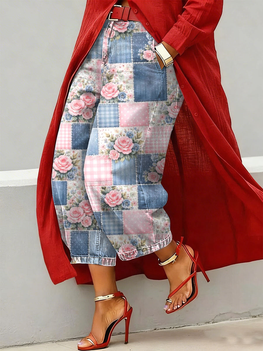 Women's Vintage Splicing Flower Art Print Casual Jeans