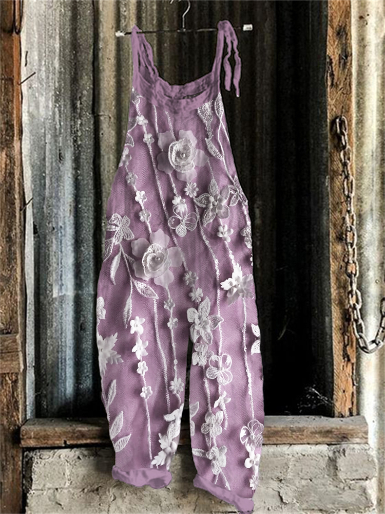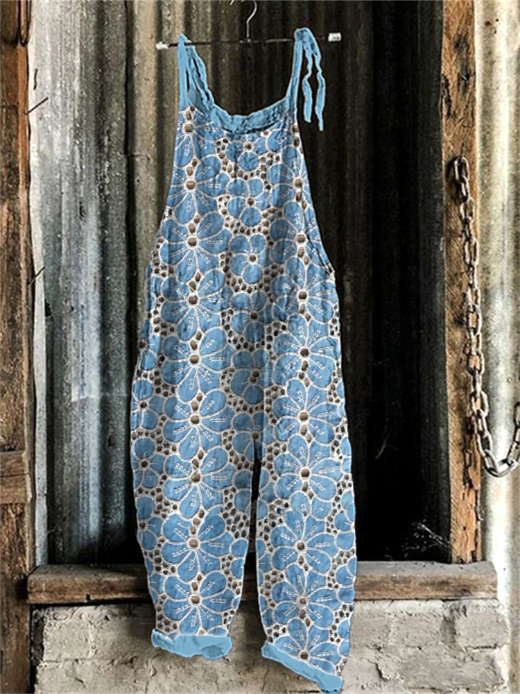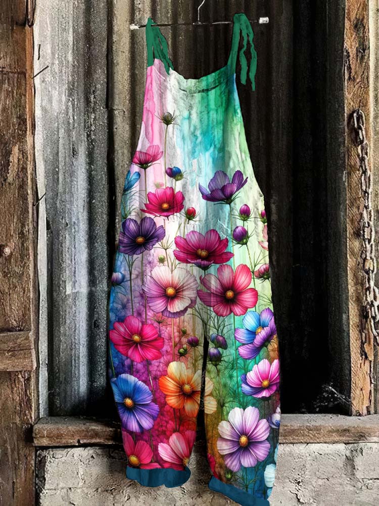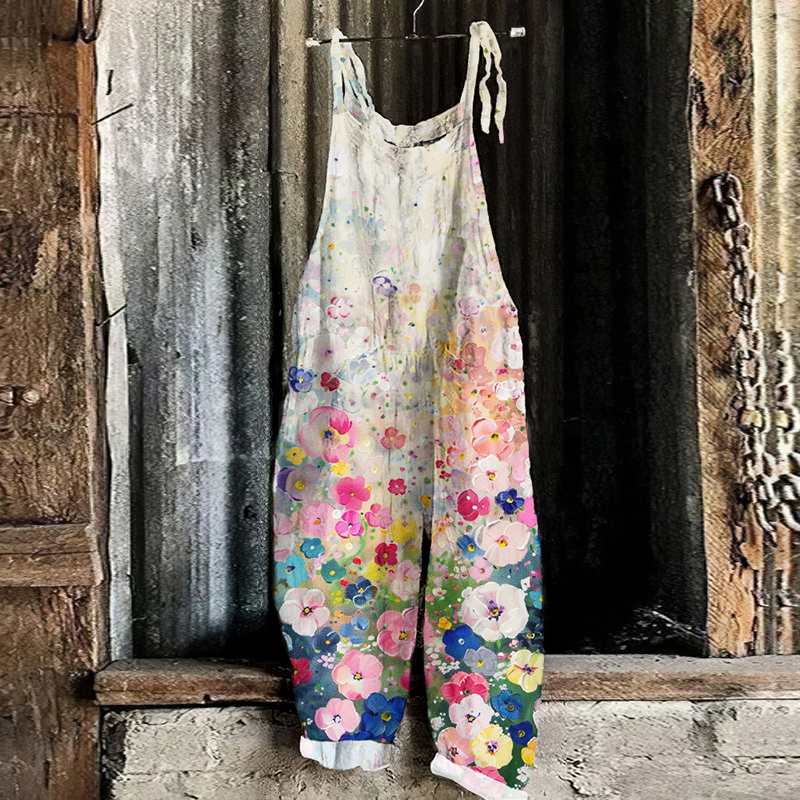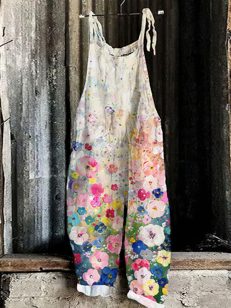 Vintage Colorful Flowers Art Print Linen Loose Casual Jumpsuit