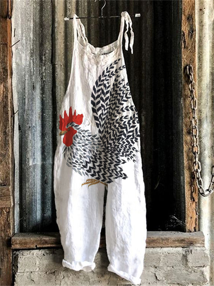Vintage Farm Chicken Pattern Linen Blend Jumpsuit